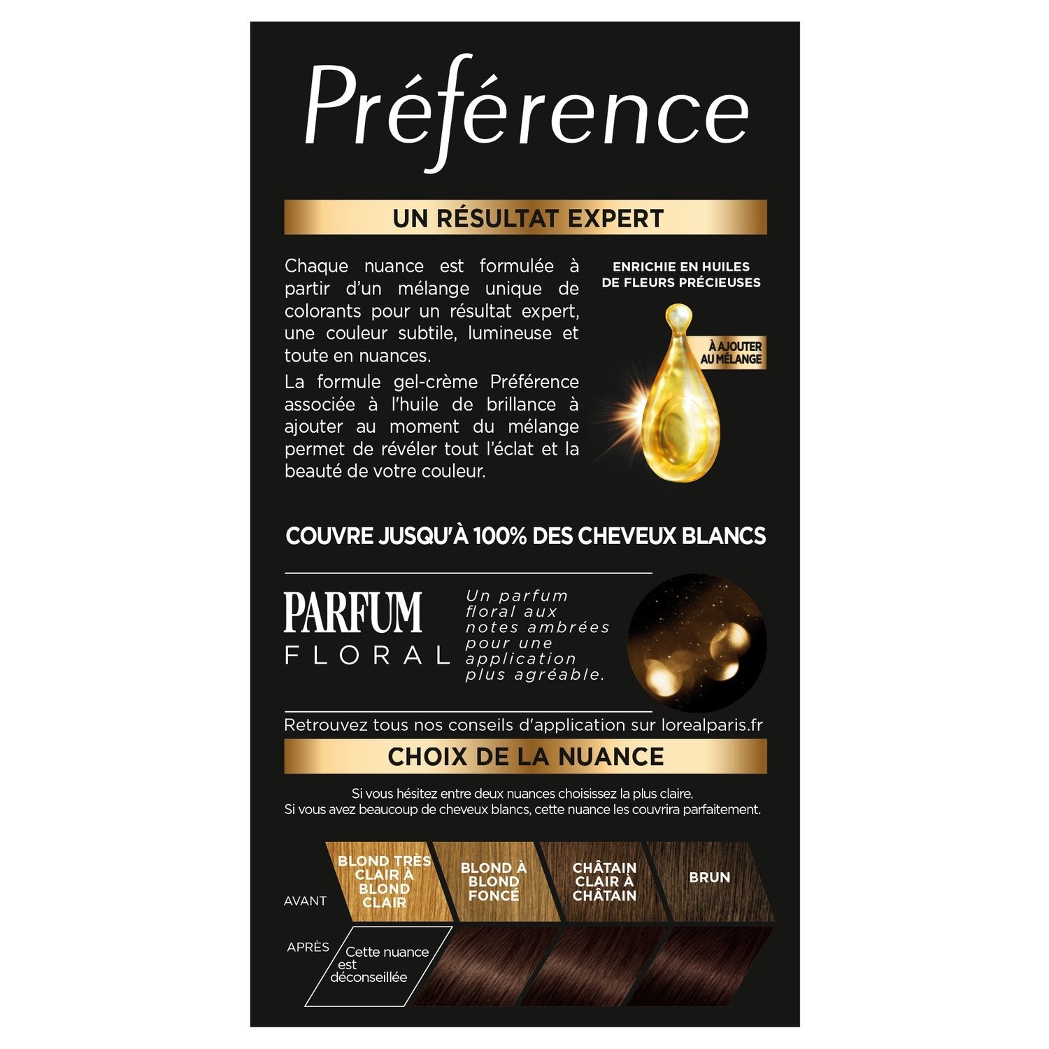 Couleur profonde et lumineuse riche en reflets. Nouvelle huile brillance enrichie en fleurs précieuses inclus dans le kit. Chaque nuance est formulée à partir d'un mélange unique de colorants pour un résultat expert, une couleur subtile, lumineuse et, toute en nuances. La formule gel-crème Préférence associée à la nouvelle huile de brillance à ajouter au moment du mélange permet de révéler tout l'éclat et la beauté de votre couleur. Nouveau parfum floral aux notes ambrées pour une application plu,s agréable. Couvre 100% des cheveux blancs.
