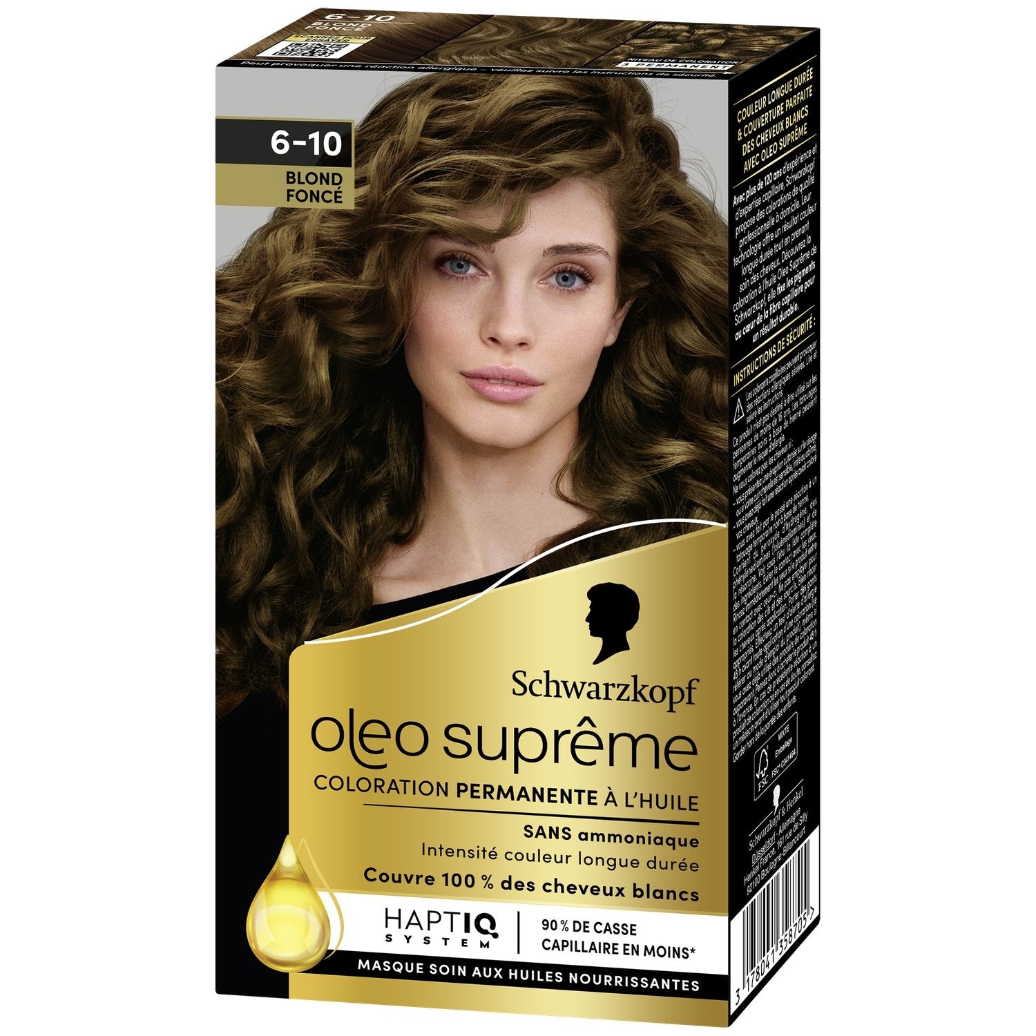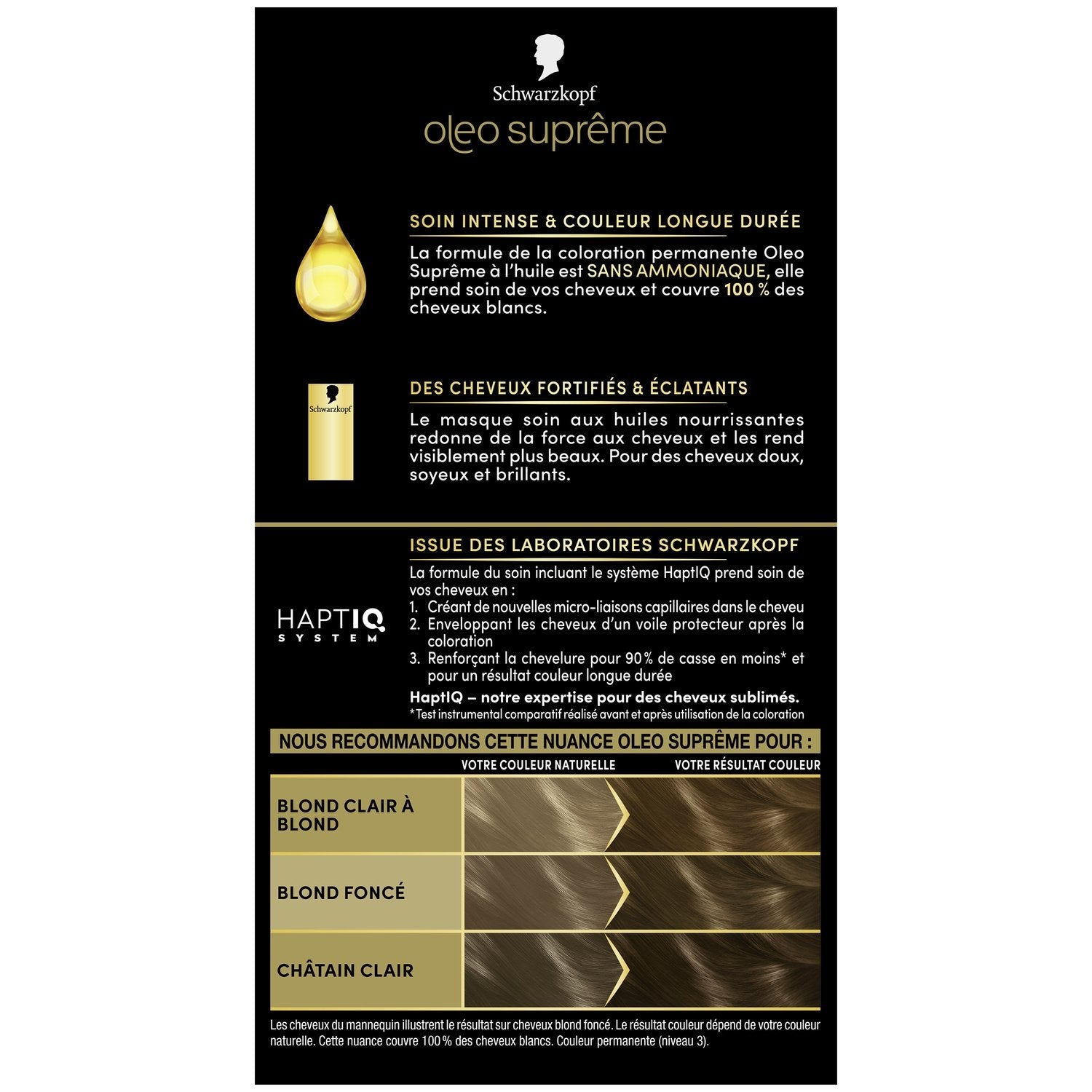 SOIN INTENSE & COULEUR LONGUE DUREE La formule de la coloration permanente Oleo Suprême à l'huile est SANS AMMONIAQUE, elle prend soin de vos cheveux et couvre 100 % des cheveux blanc. DES CHEVEUX FORTIFIES & ECLATANTS Le masque soin aux huiles nourrissantes redonne de la force aux cheveux et les rend visiblement plus beaux. Pour des cheveux doux, soyeux et brillants.