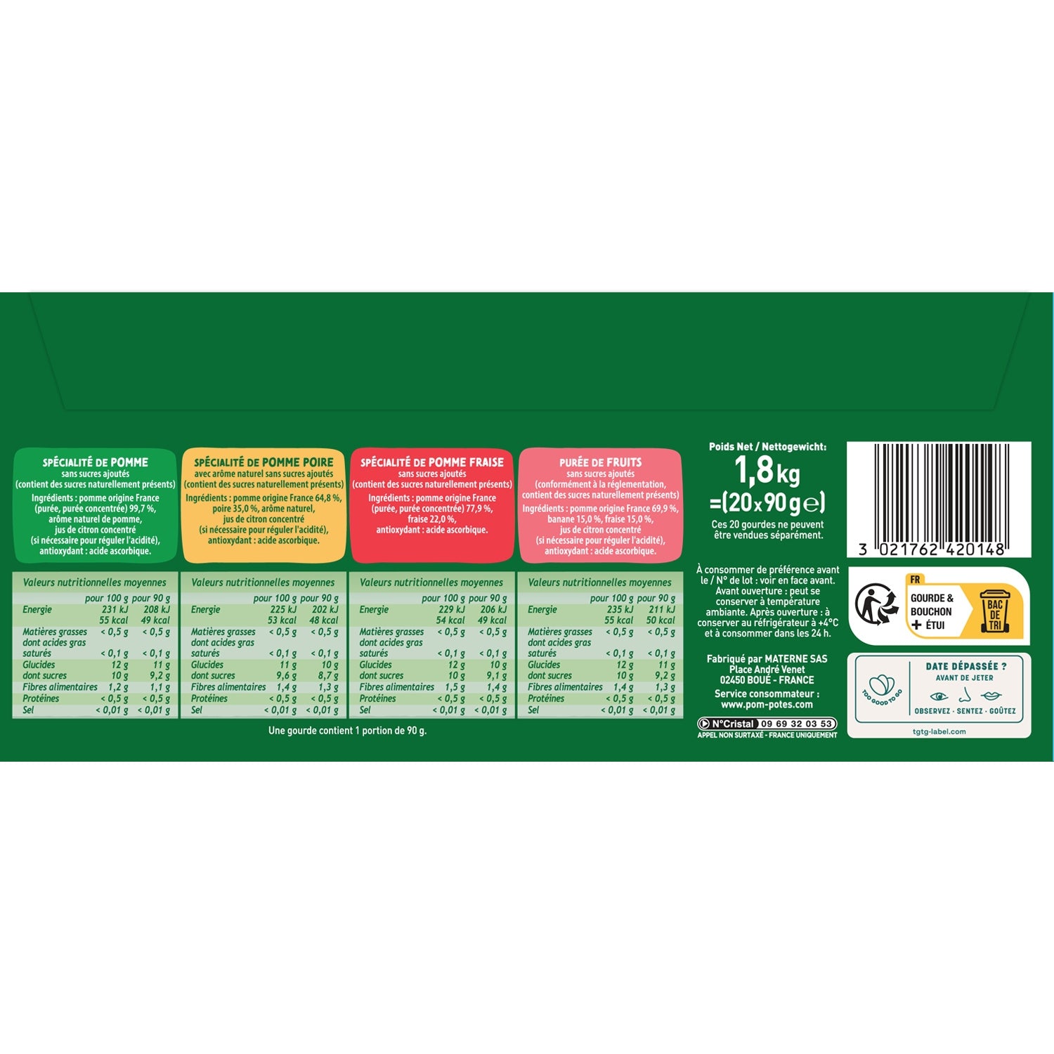 Pomme : pomme origine France 99,7% (purée et purée concentrée), arôme naturel de pomme, jus de citron concentré (si nécessaire pour réguler l'acidité), antioxydant : acide ascorbique. Pomme Poire : pomme origine France 64,8 % (purée et purée concentrée), poire 35,0 %, arôme naturel, jus de citron concentré (si nécessaire pour réguler l'acidité), antioxydant : acide ascorbique. Pomme Fraise : pomme origine France 77,9% (purée et purée concentrée), fraise 22 %, cassis, antioxydant : acide ascorbique. Pomme Banane Fraise : pomme origine France 69,9 %, banane 15,0%, fraise 15,0%, jus de citron concentré (si nécessaire pour réguler l'acidité), antioxydant : acide ascorbique.
