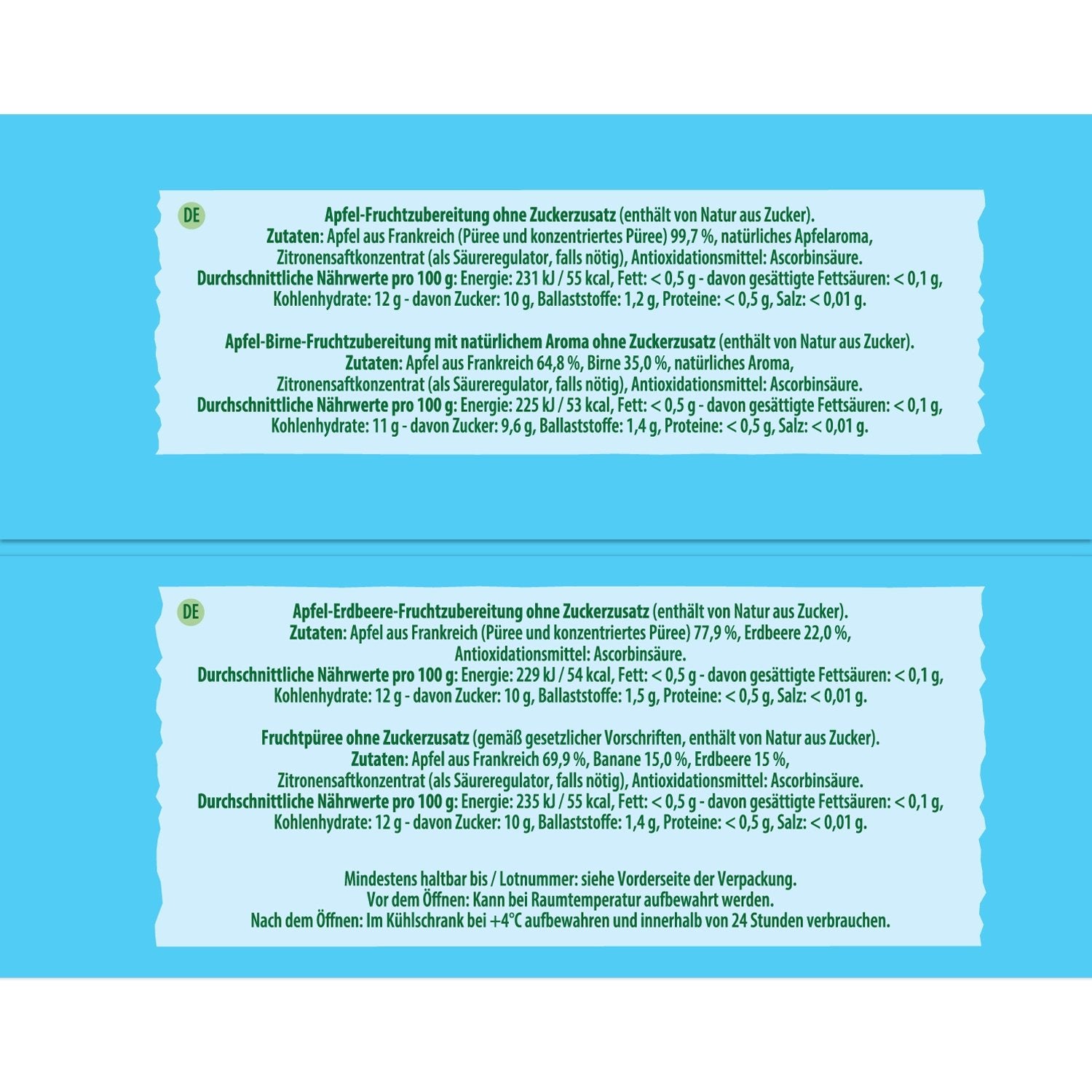 Spécialité de pomme sans sucres ajoutés (contient des sucres naturellement présents). Spécialité de pomme poire sans sucres ajoutés (contient des sucres naturellement présents). Spécialité de pomme fraise sans sucres ajoutés (contient des sucres naturellement présents). Purée de fruits sans sucres ajoutés (contient des sucres naturellement présents).