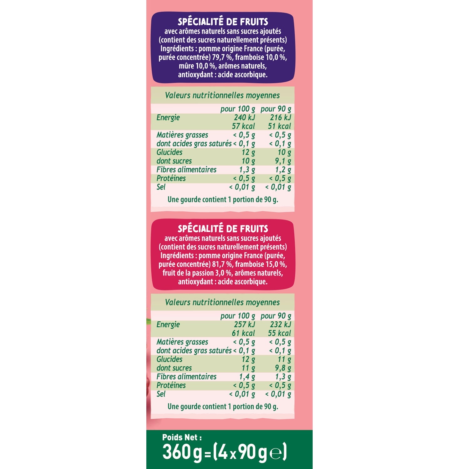 Pomme Framboise Mûre : pomme (purée, purée concentrée) 79,7%, framboise 10,0%, mûre 10,0%, arômes naturels, antioxydant : acide ascorbique. Pomme Framboise Passion : pomme (purée, purée concentrée) 81,7 %, framboise 15,0 %, fruit de la passion 3,0 %, arômes naturels, antioxydant : acide ascorbique.