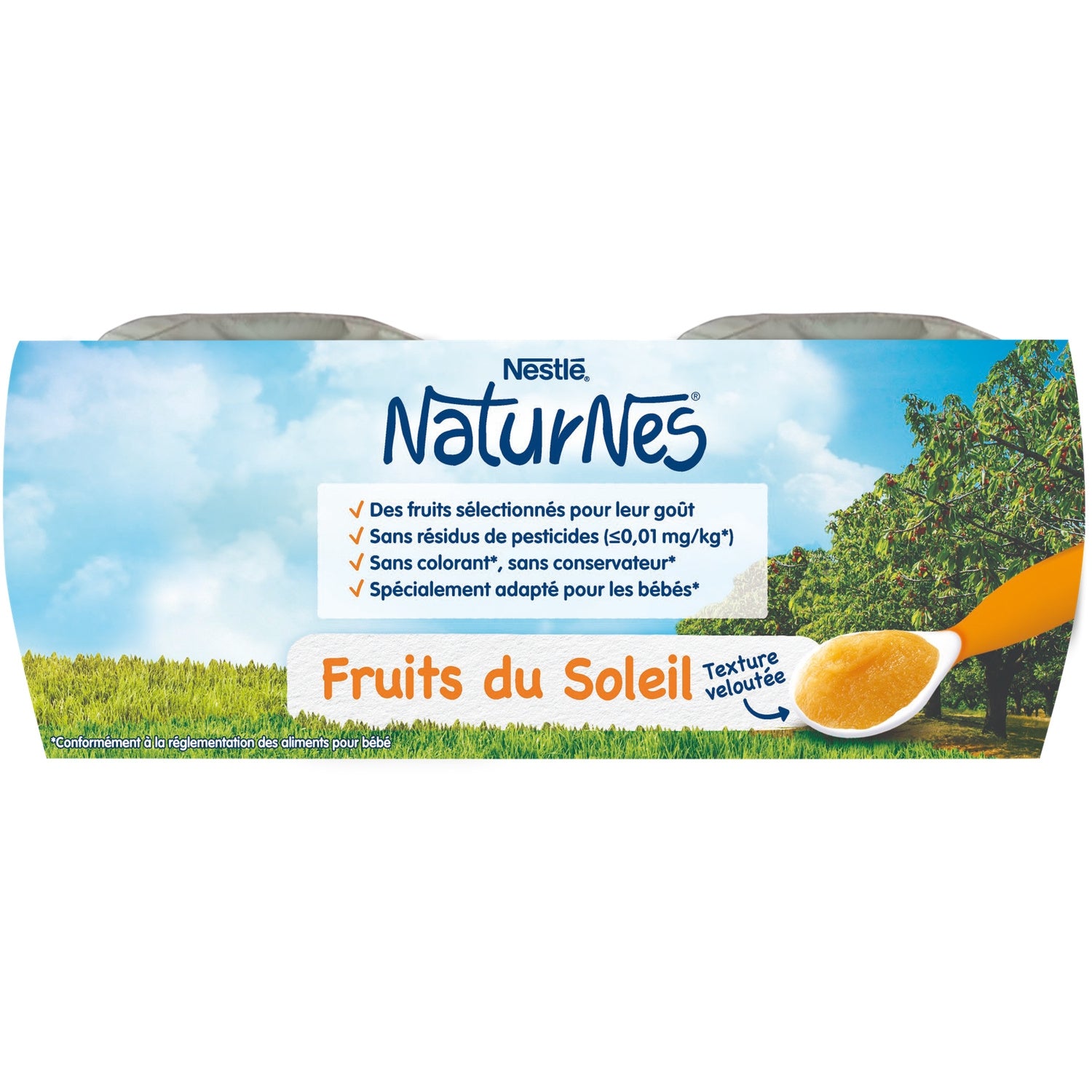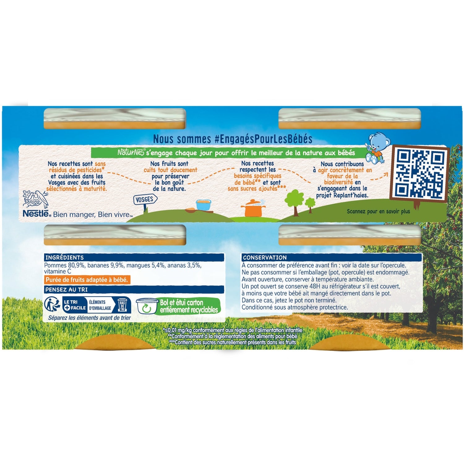NaturNes® contribue à prendre soin de ce que nous offre la nature afin de le donner à bébé, en sélectionnant de bons fruits à maturité, puis en en préservant leur goût grâce à un mode de cuisson douce. Ainsi bébé découvre le bon goût de la nature dans chaque cuillère de nos petits pots, tous élaborés en France, dans les Vosges. Entre 4 et 6 mois, demandez conseil à votre médecin pour bien démarrer la diversification. Pommes origine UE. Bananes, ananas et mangues origine non UE.