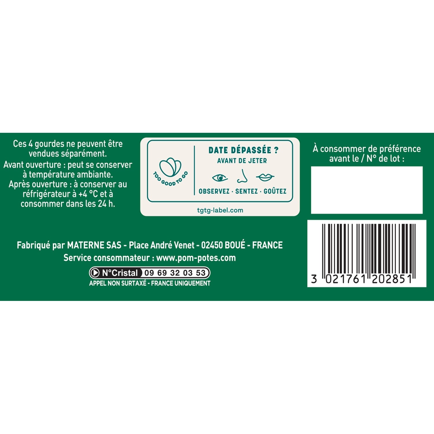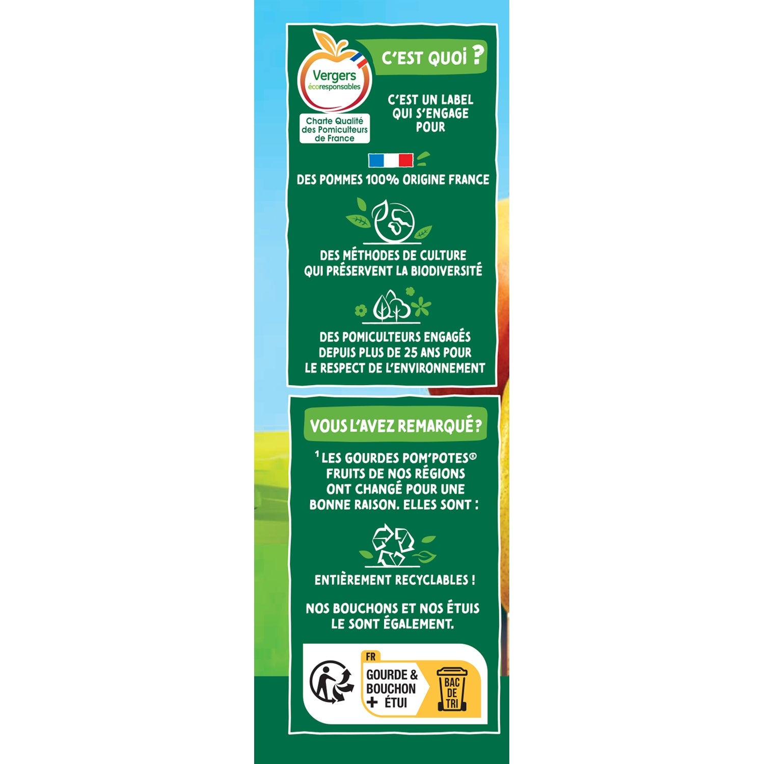 POM'POTES® Fruits de Nos Régions, c'est la combinaison savoureuse de pommes origine France issues de Vergers écoresponsables et d'un bon fruit de nos régions. Chez POM'POTES®, on s'engage pour le bien-être et le plaisir des petits et des grands dégourdis ! Chacune de nos gourdes est sans sucres ajoutés* et correspond à 1 des 5 portions de fruits et légumes recommandées quotidiennement. * Contient des sucres naturellement présents