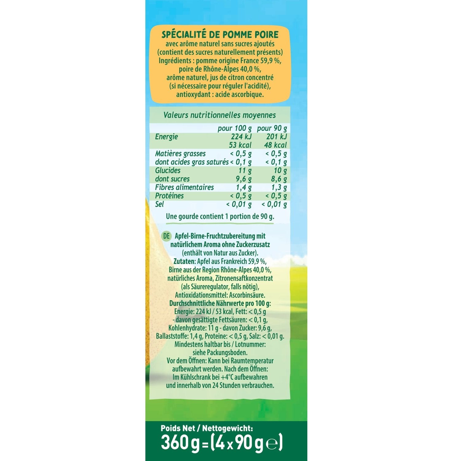 Pomme origine France 59,9 %, poire de Rhône-Alpes 40,0 %, arôme naturel, jus de citron concentré (si nécessaire pour réguler l'acidité), antioxydant : acide ascorbique.