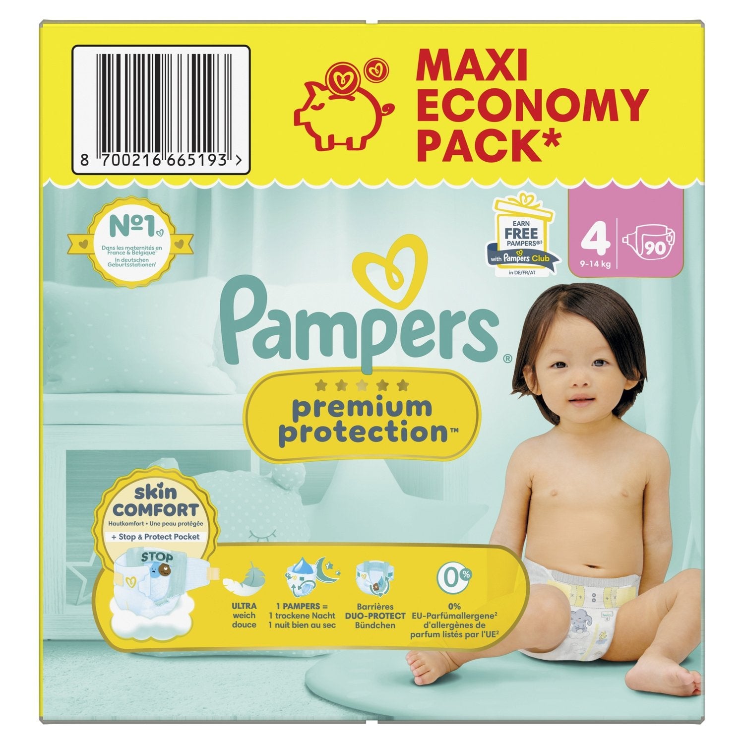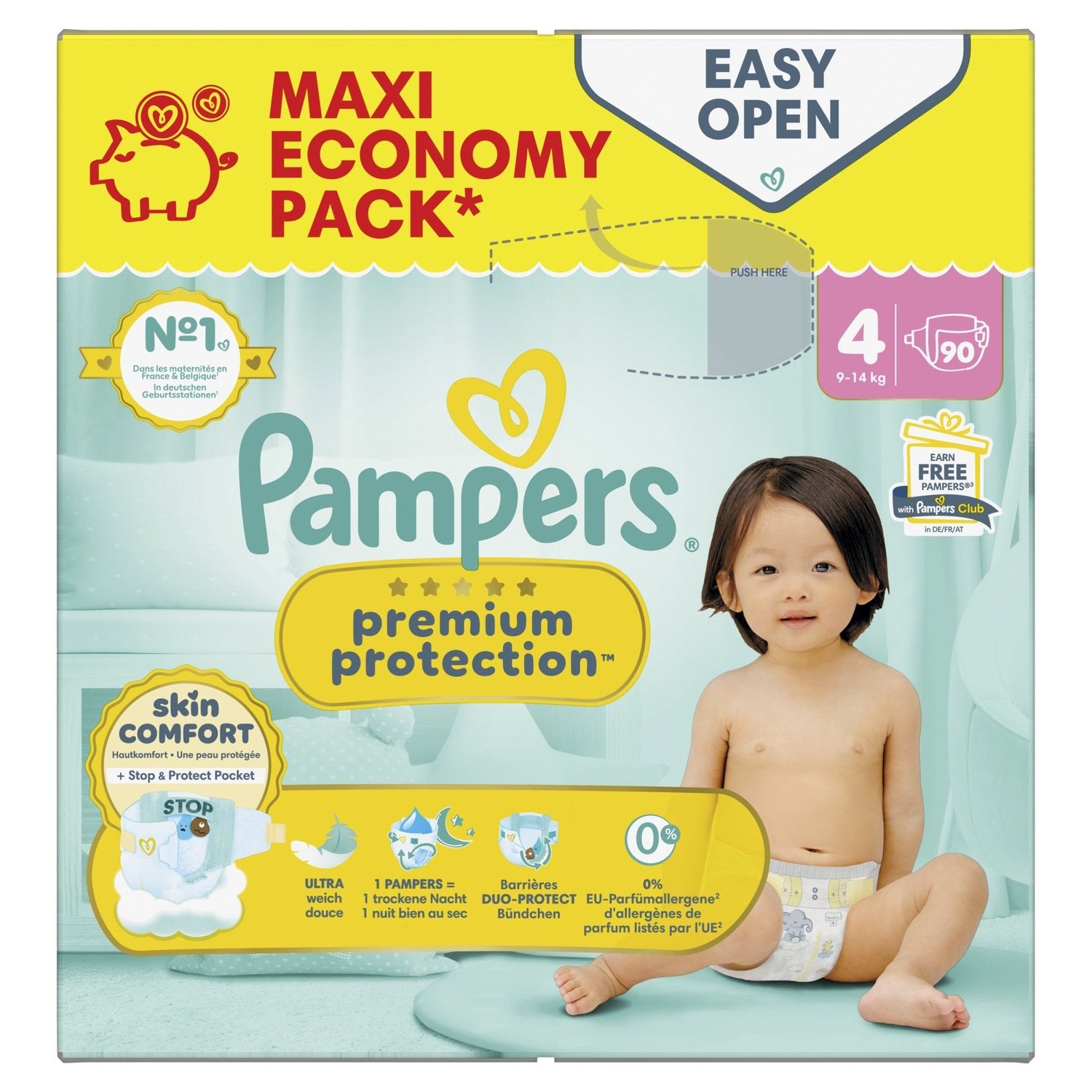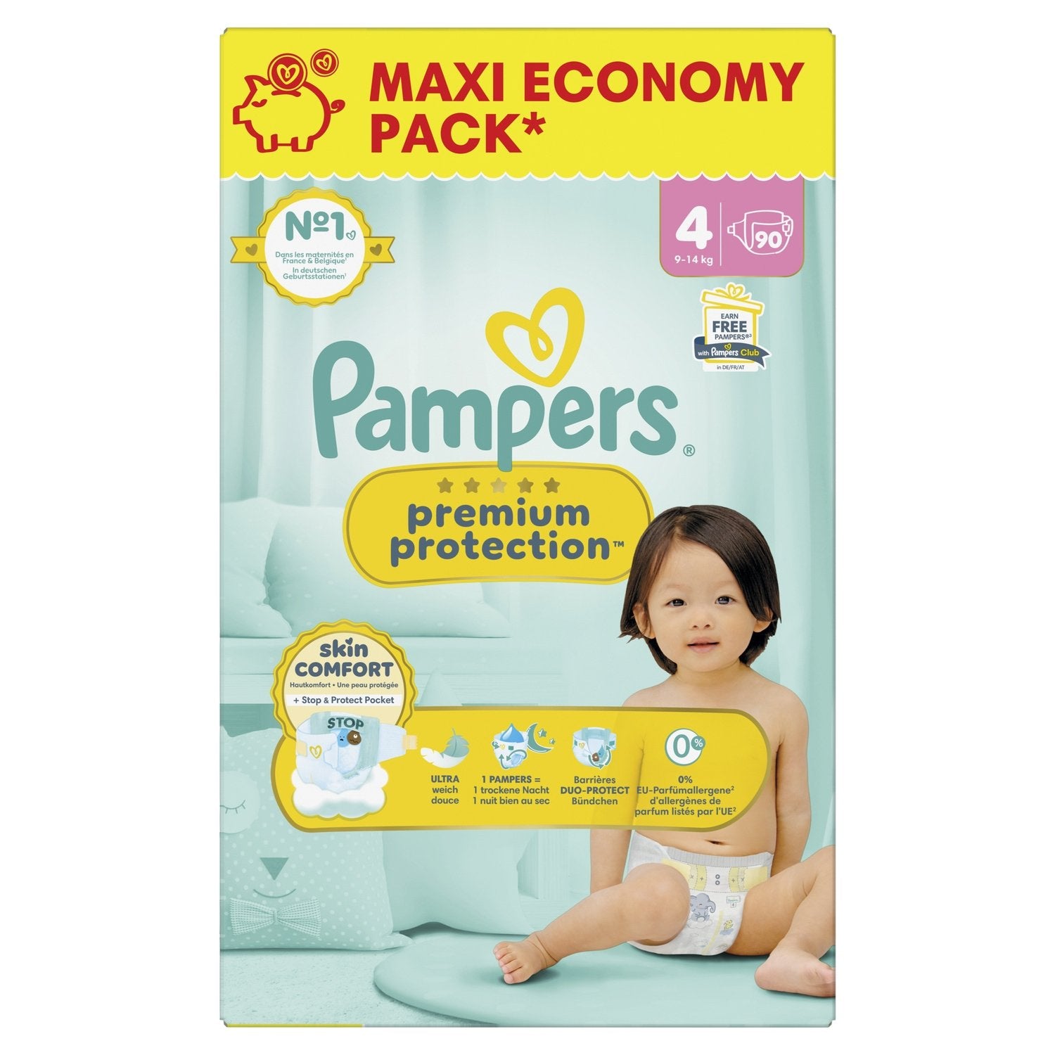 Pampers Premium Protection Taille 4, 90 Couches, 9kg-14kg, Double Protection Pour La Peau Et Contre Les Fuites