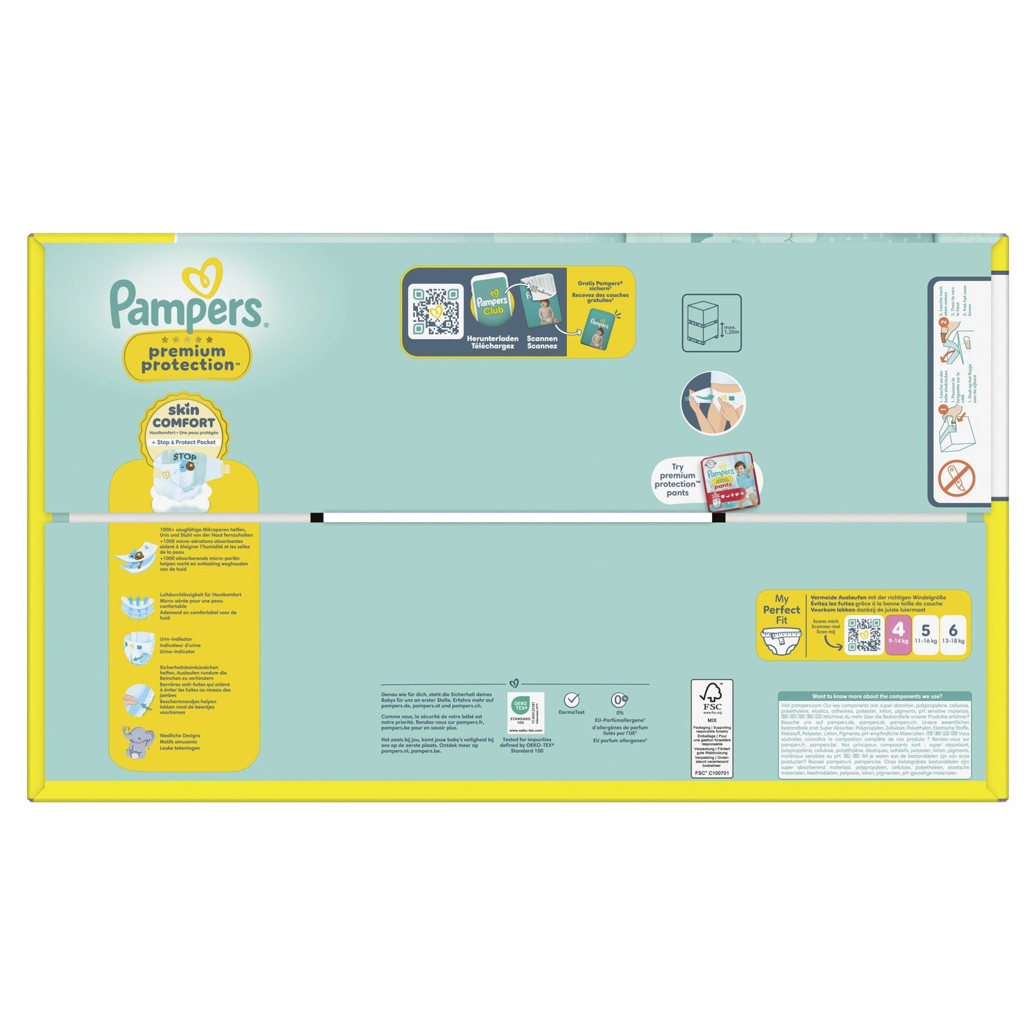DOUBLE PROTECTION : pour la peau et contre les fuites. Les couches Pampers N°1 pour le confort et la protection des peaux sensibles - testées et approuvées par des bébés. Nous avons conçu la couche Pampers N°1 spécialement pour la peau délicate des nouveau-nés. C'est également notre couche N°1 contre les fuites. Les couches Pampers Premium Protection offrent notre meilleure protection, grâce à 1) une ABSORPTION INSTANTANÉE, avec plus de 1 000 micro-alvéoles absorbantes qui éloignent instantanément l'humidité et les selles molles de la peau et les capturent au cœur de la couche, pour protéger la peau et la garder bien au sec. 2) POCHE UNIQUE STOP & PROTECT pour capturer les fuites à l'arrière de la couche. 3) Des MATIÈRES ULTRA-DOUCES pour envelopper votre bébé dans un nuage de confort et de protection. Et 4) notre technologie unique COMFORT FIT avec un système d'attaches superposables. Les couches Pampers Premium Protection, le choix N°1 des maternités en France*, sont 100% sûres pour la peau de votre bébé. Elles sont testées dermatologiquement et ne contiennent aucun des allergènes de parfum listés par l'UE (comme réglementé par la réglementation cosmétique de l'UE N°1223/2009). Pas étonnant que les bébés approuvent.
