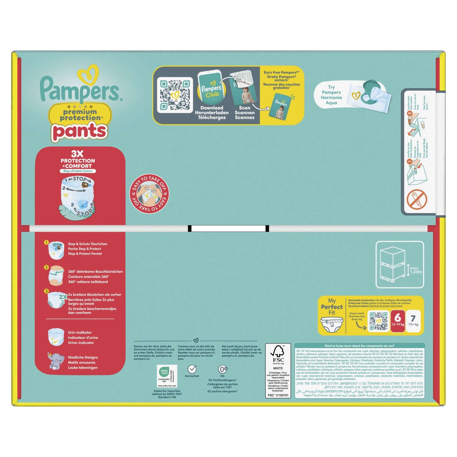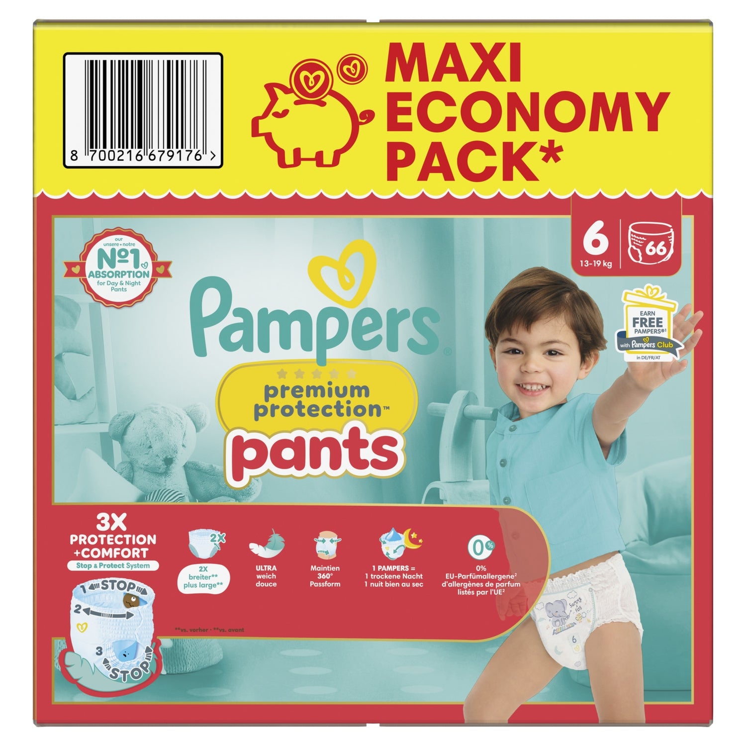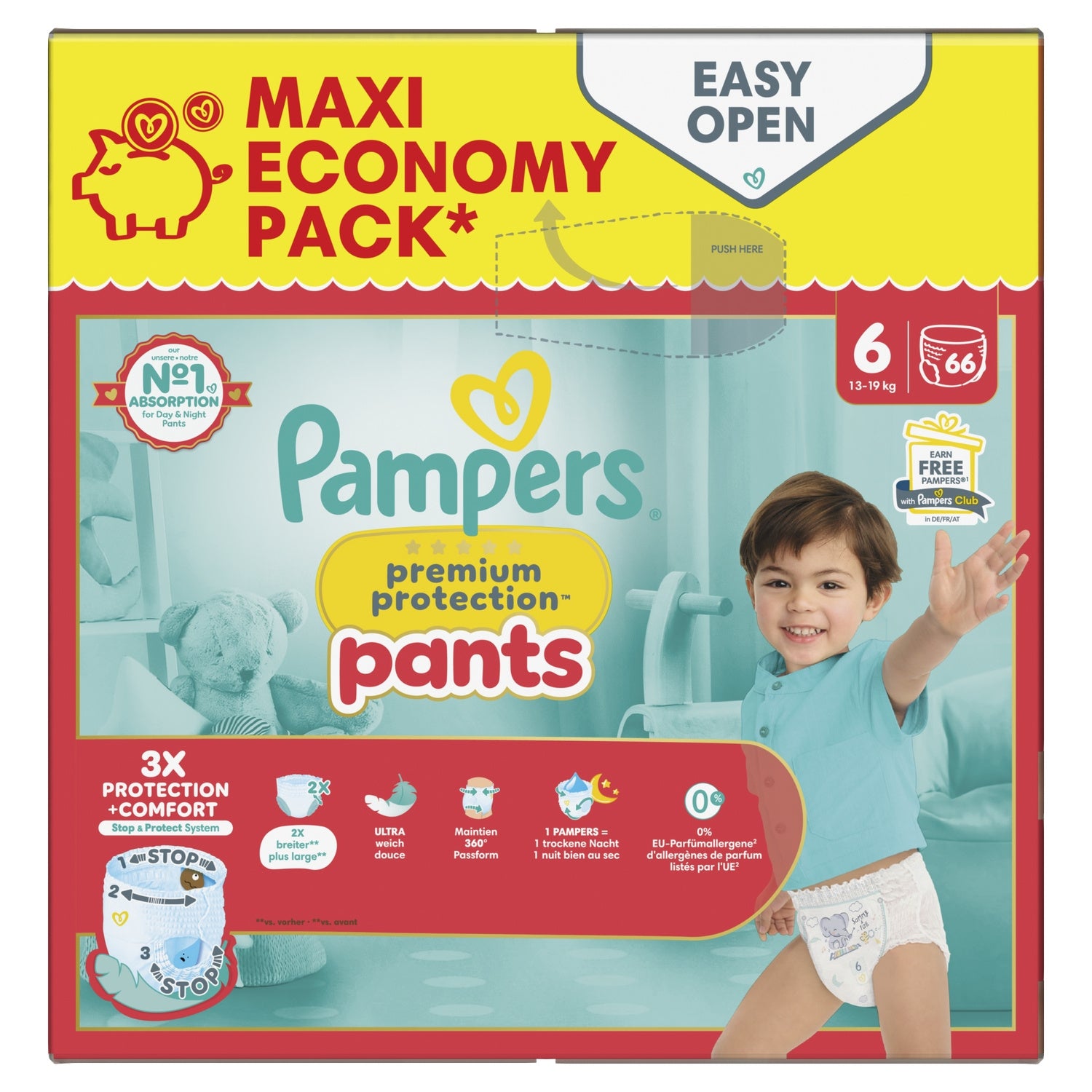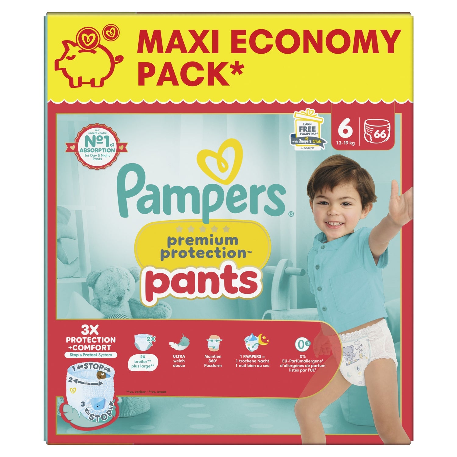 Pampers Premium Protection Pants Taille 6, 66 Couches-Culottes, 13kg-19kg, Avec un Maintien 360° et des Barrières Anti-fuites Douces qui sont 2 fois plus larges qu'avant pour Notre Meilleur Confort et Notre Meilleure Protection