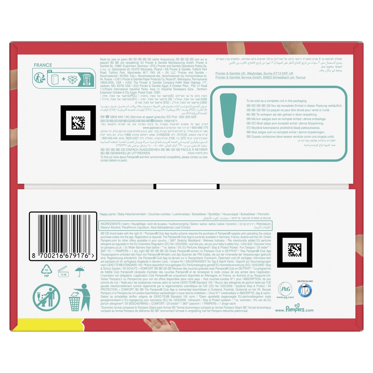 Notre maintien le plus confortable pour protéger la peau de votre bébé contre les irritations et les fuites ,Les barrières anti-fuites douces sont 2 fois plus larges* et aident à éviter les fuites au niveau des jambes (*par rapport à avant) , Poche Stop & Protect pour aider à arrêter les fuites à l'arrière de la couche-culotte ,La ceinture ultra-douce 360° s'adapte à la morphologie de votre tout-petit lorsqu'il bouge ,Avec un cœur super absorbant qui absorbe l'humidité instantanément , Couches-culottes faciles à changer : faciles à enfiler, à retirer, à replier, à enrouler et à jeter, Approuvée par les dermatologues de la Skin Health Alliance comme étant sans danger au contact de la peau de bébé ,À utiliser avec les lingettes Pampers