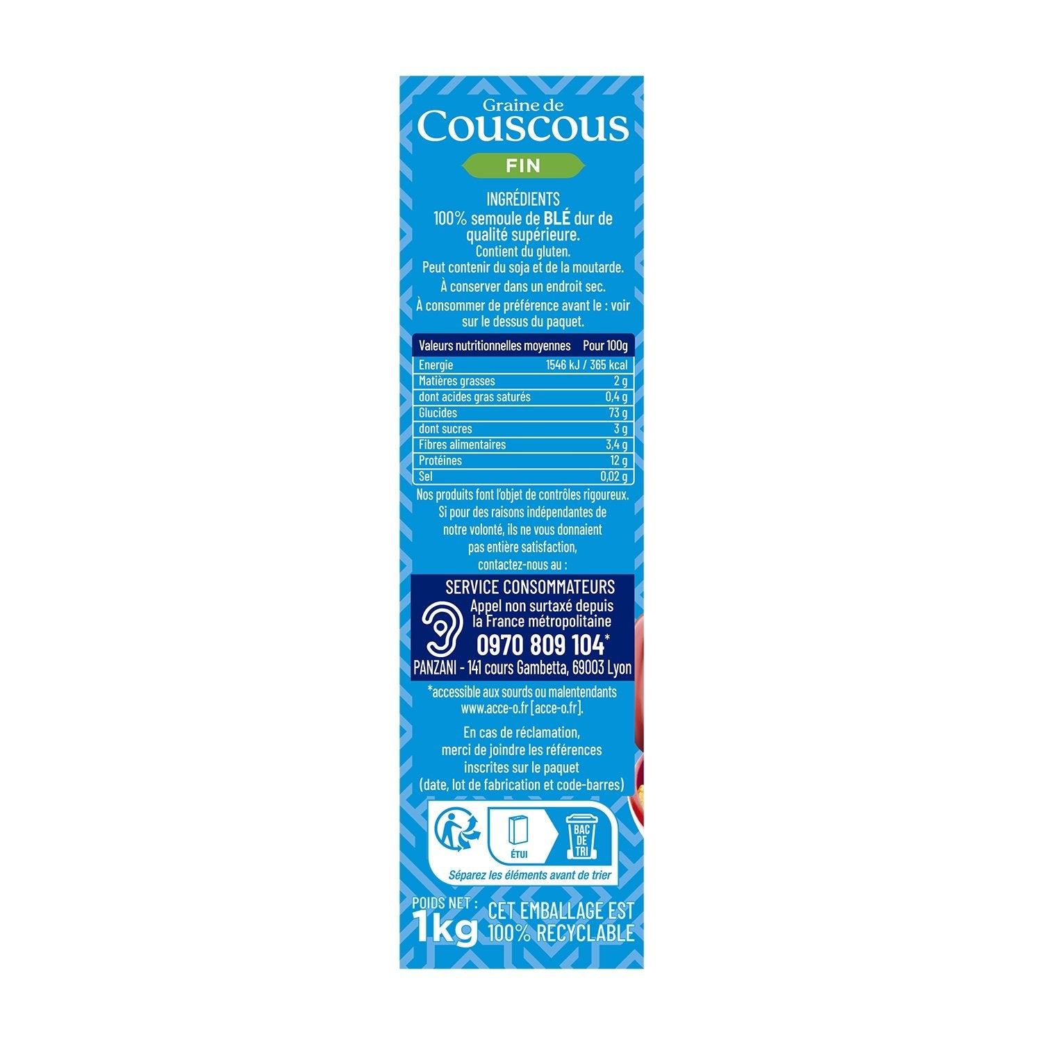 100% Semoule de BLÉ dur de qualité supérieure.Contient du GLUTEN.Peut contenir de la MOUTARDE et du SOJA.