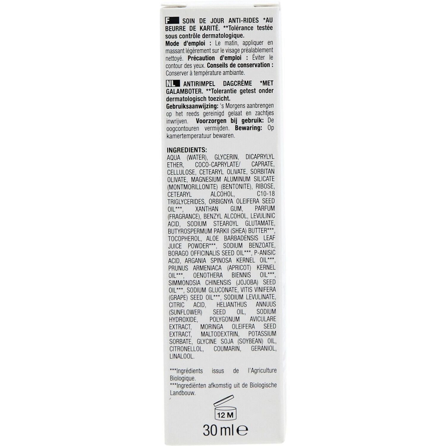 Aqua (water), glycerin, dicaprylyl ether, coco-caprylate/caprate, cellulose, cetearyl olivate, sorbitan olivate, magnesium aluminum silicate (montmorillonite) (bentonite), ribose, cetaryl alcohol, C10-18 triglycerides, orbignya oleifera seed oil***, xanthan gum, parfum (fragrance), benzyl alcohol, levulinic acid, sodium stearoyl glutamate, butyrospermum parkii (shea) butter***, tocopherol, aloe barbadensis leaf juice powder***, sodium benzoate, borago officinalis seed oil***, P-anisic acid, argania spinosa kernel oil***, prunus armeniaca (apricot) kernel oil***, oenothera biennis oil***, simmondsia chinensis (jojoba) seed oil***, sodium gluconate, vitis vinifera (grape) seed oil***, sodium levulinate, citric acid, helianthus annuus (sunflower) seed oil, sodium hydroxide, polygonum aviculare extract, moringa oleifera seed extract, maltodextrin, potassium sorbate, glycine SOJA (soybean) oil, citronellol coumarin, geraniol, linalool. ***Ingrédients issus de l'Agriculture biologique.