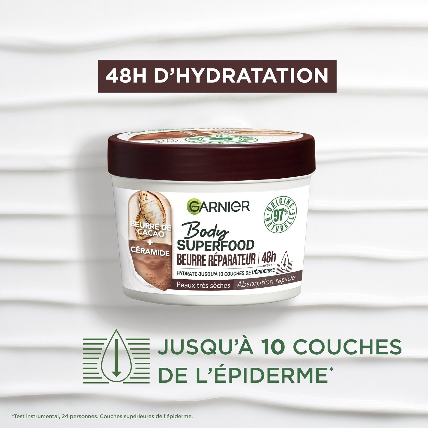 Découvrez le nouveau soin du corps Garnier Body Superfood ! 48h d'hydratation jusqu'à 10 couches de l'épiderme dans une formule à 97% d'origine naturelle, vegan et approuvée par Cruelty Free International. Hydrate 48h.