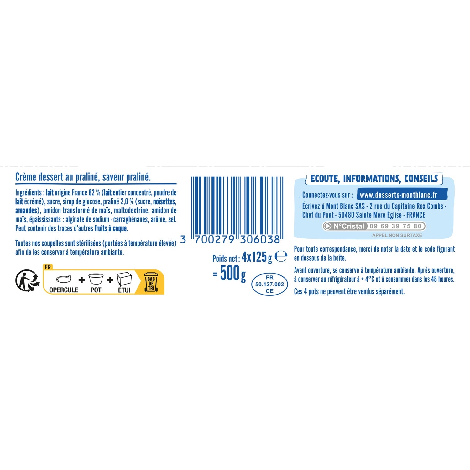 LAIT origine France 82 % (LAIT entier concentré, poudre de LAIT écrémé), sucre, sirop de glucose, praliné 2,0 % (sucre, NOISETTES, AMANDES), amidon transformé de maïs, maltodextrine, amidon de maïs, épaississants : alginate de sodium - carraghénanes, arôme, sel.