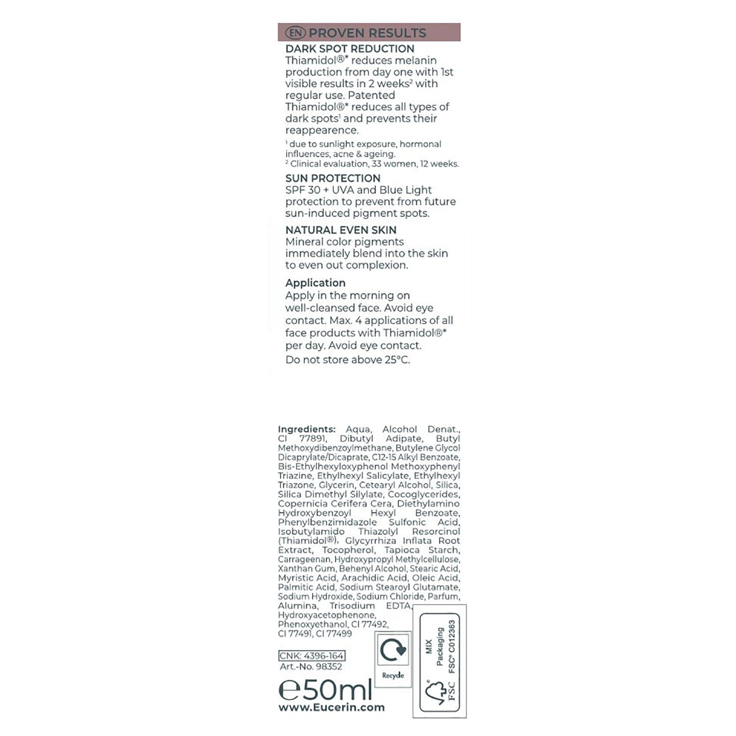 Le Soin de Jour teinté Light SPF30 Anti-Pigment contient du Thiamidol* breveté et une protection SPF 30 + UVA qui réduit efficacement les taches brunes et prévient leur réapparition avec une utilisation régulière. Les pigments minéraux colorés se fondent instantanément sur la peau et couvrent les taches brunes. Résultats : Pour un teint à l'apparence naturelle et immédiatement unifiée, et une réduction durable des taches brunes grâce à une application régulière. Premiers résultats visibles dès 2 semaines**. Des études cliniques et dermatologiques le prouvent : Très bonne tolérance cutanée et efficacité. Convient à tous les types de peaux. Appliquez une fois par jour le matin. Utilisez des produits contenant du Thiamidol* au maximum 4 fois par jour. Evitez le contact avec les yeux. Ne pas conserver à plus de 25°C. *Thiamidol brevété (EP 2 758 381 B1) France, Belgique, Pays-Bas. ** Évaluation clinique, 33 femmes, 12 semaines.