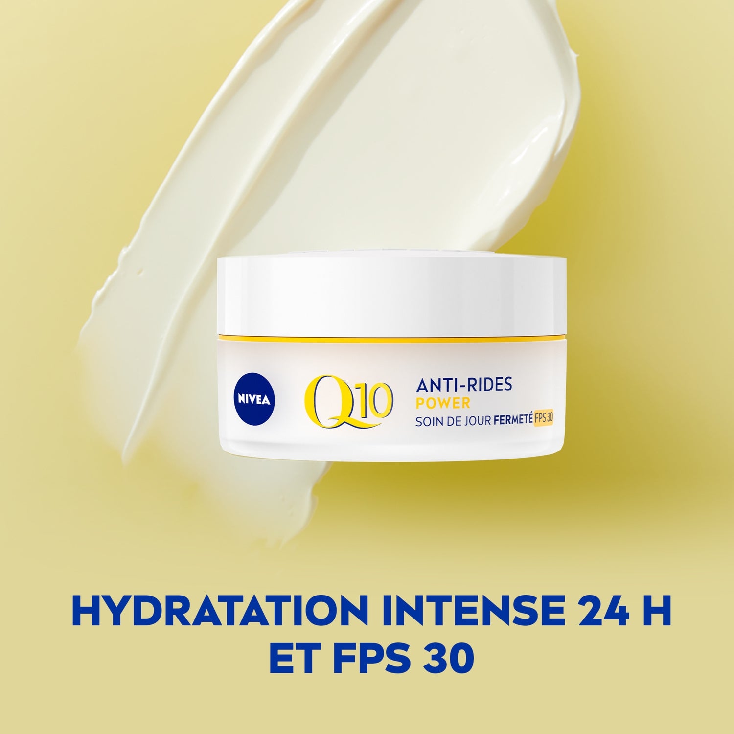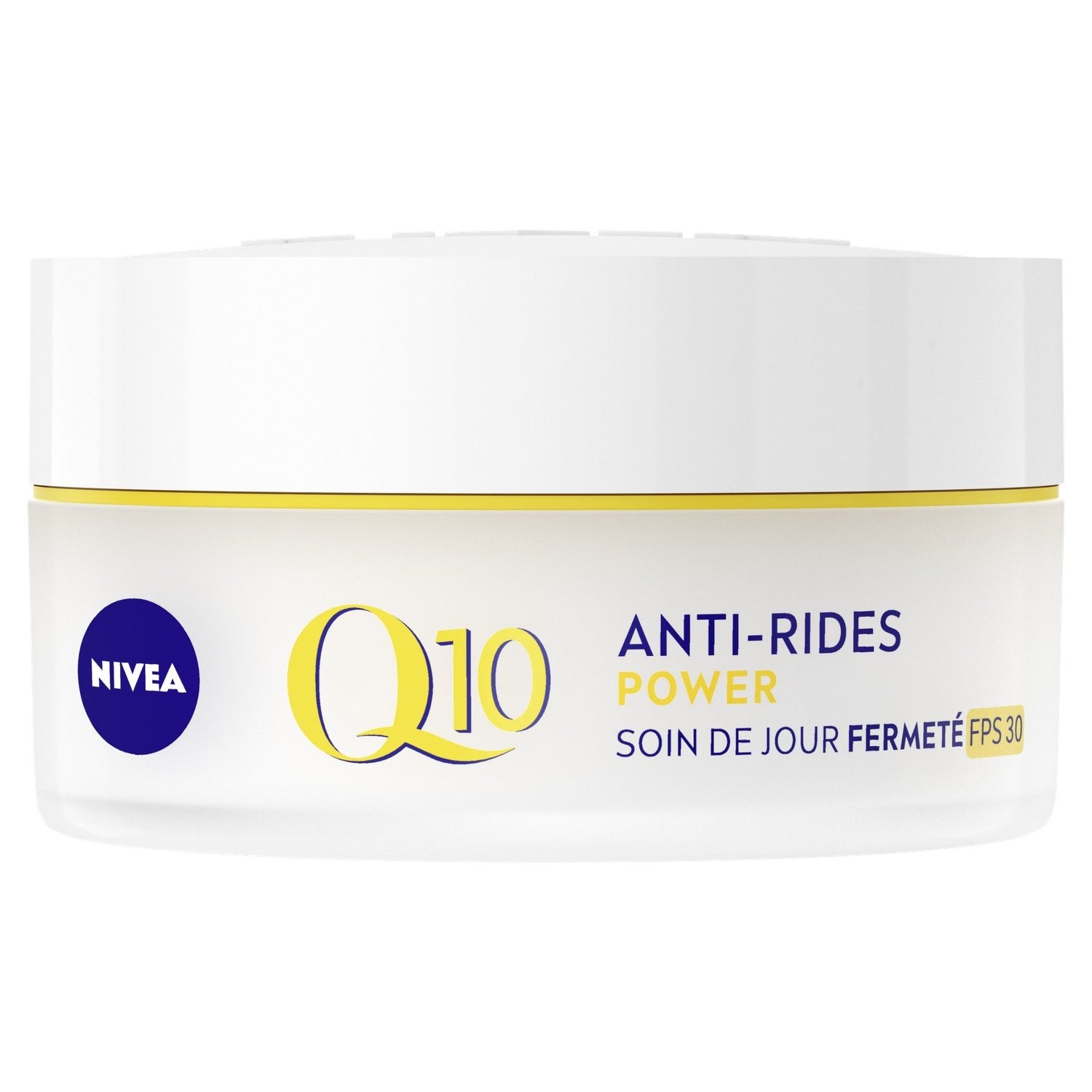 La formule du Soin de jour Q10 POWER FPS30 anti-rides et fermeté de NIVEA, contient de la Créatine et du coenzyme Q10 naturel haute qualité pour une double action anti-rides 24h : . Protège les cellules contre les radicaux libres et les agressions extérieures, responsables du vieillissement cutané . Redonne de l'énergie aux cellules et aide la peau du visage à se régénérer Le Soin réduit visiblement les rides et prévient leur apparition. Il protège la peau des rayons UVA/UVB, responsables du vieillissement prématuré de la peau. La peau est nourrie, raffermie et les rides d'expression sont visiblement lissées.