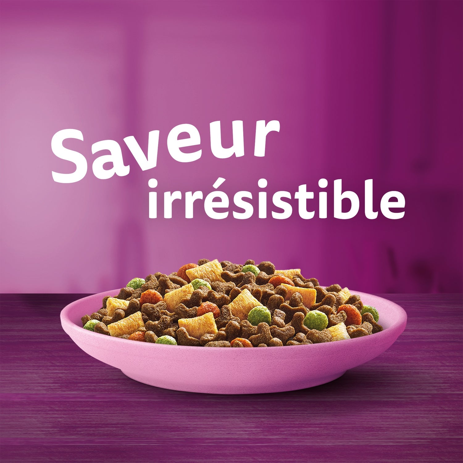 Composition: céréales, viandes et sous-produits animaux (dont poulet 4% dans les croquettes marron*), sous-produits d'origine végétale, huiles et graisses, substances minérales, extraits de protéines végétales, sucres, légumes (dont carottes déshydratées 0.5% (équivalent à 4% de carottes) dans les croquettes orange et petits pois déshydratés 1% (équivalent à 4% de petits pois) dans les croquettes vertes*), LAIT et produits de laiterie (dont poudre de LAIT écrémé 0.7% dans les croquettes fourrées, équivalent à 4% de LAIT écrémé*), levures. *Les croquettes marron représentent environ 70% de la totalité des croquettes de ce sac, les croquettes fourrées représentent environ 14% de la totalité des croquettes de ce sac, les croquettes orange et les croquettes vertes représentent chacune environ 8% de la totalité des croquettes de ce sac.