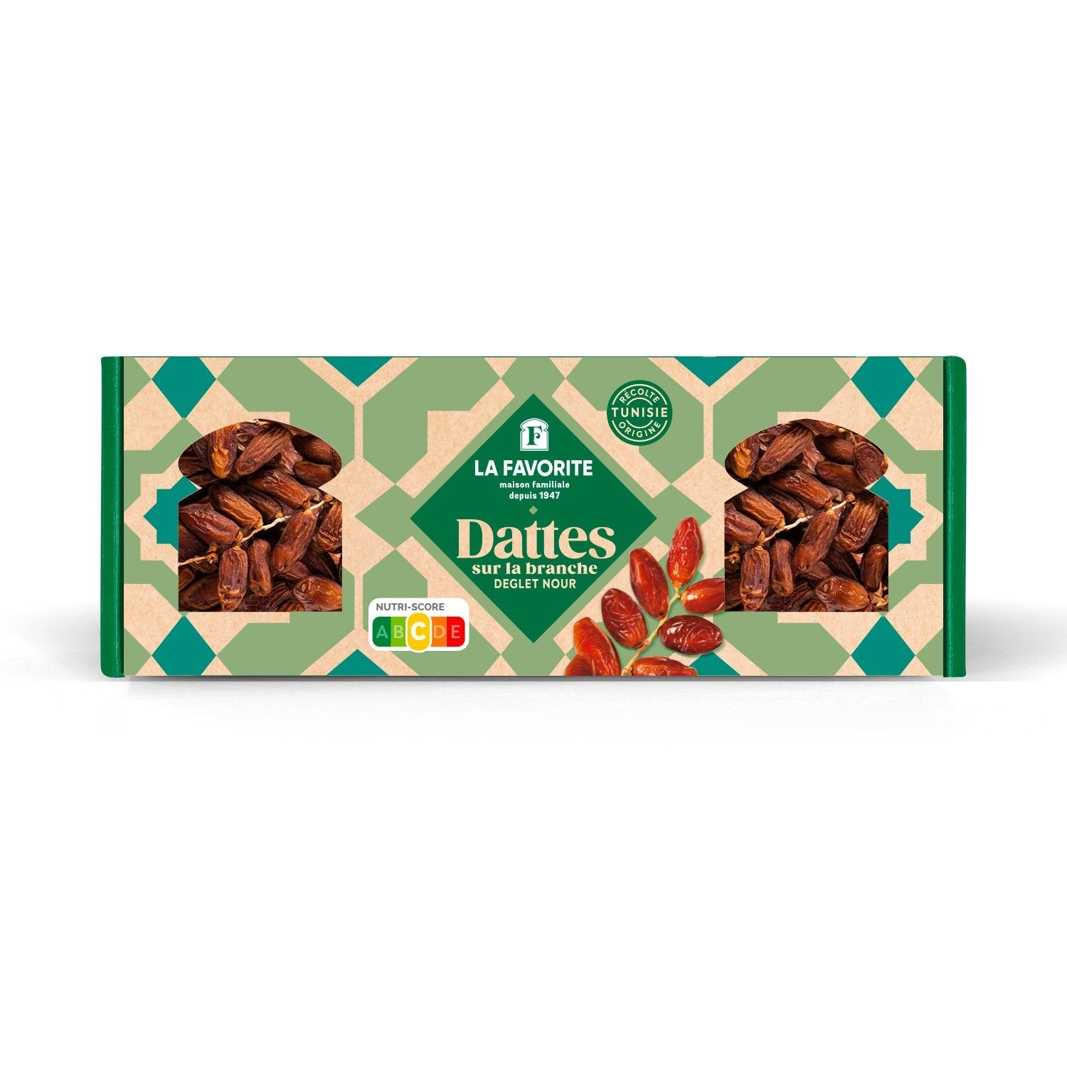 La Favorite vous propose un coffret unique de dattes naturelles branchées. A maturité, les branches des régimes de dattes sont coupées et conditionnées directement dans les grands coffrets La Favorite : nous avons créé ce coffret unique (modèles déposé) qui permet de conserver la branche dans son intégrité et de préserver la qualité du produit. Issues des oasis de Tunisie, les dattes de la variété Deglet Nour sont les plus consommées en France : leur chair savoureuse et mielleuse caractéristique ainsi que leur couleur ambrée en font une vraie gourmandise.