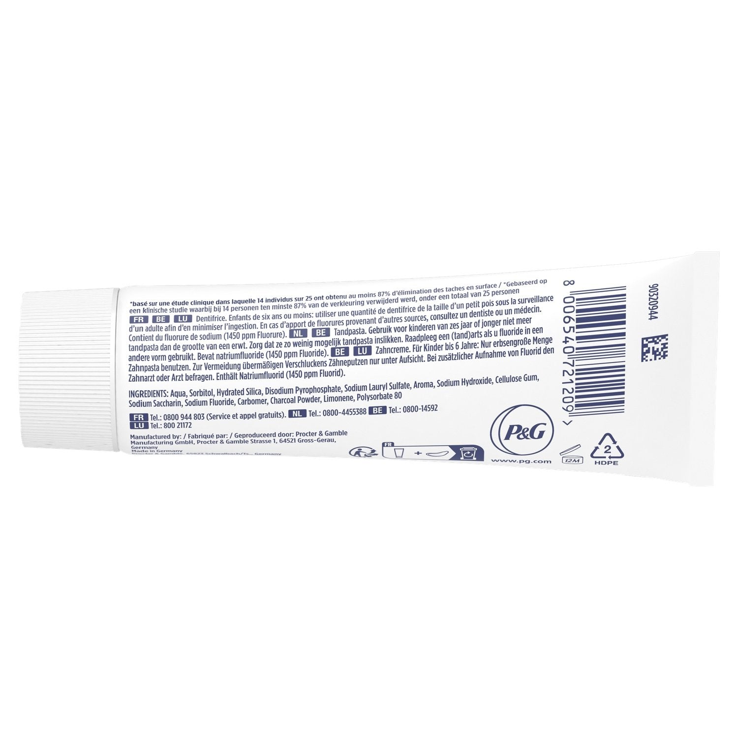 Blanchit en éliminant jusqu'à 87 % des taches en surface ,Effet blancheur constaté dès le premier brossage , Cliniquement prouvé ,Pour un sourire éclatant de blancheur ,Dentifrice doux pour l'émail