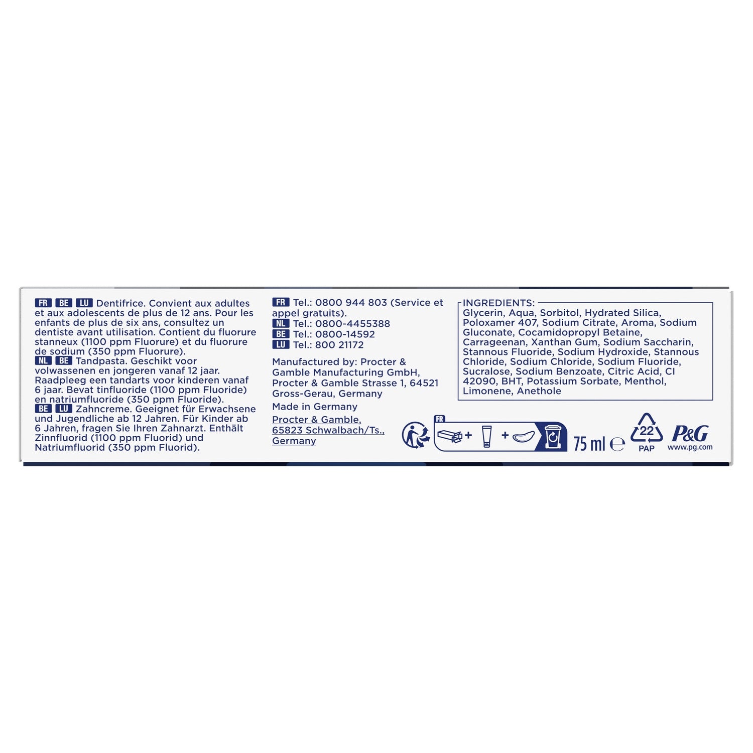 Glycerin, Aqua, Sorbitol, Hydrated Silica, Poloxamer 407, Sodium Citrate, Aroma, Sodium Gluconate, Cocamidopropyl Betaine, Carrageenan, Xanthan Gum, Sodium Saccharin, Stannous Fluoride, Sodium Hydroxide, Stannous Chloride, Sodium Chloride, Sodium Fluoride, Sucralose, Sodium Benzoate, Citric Acid, CI 42090, BHT, Potassium Sorbate, Menthol, Limonene, Anethole