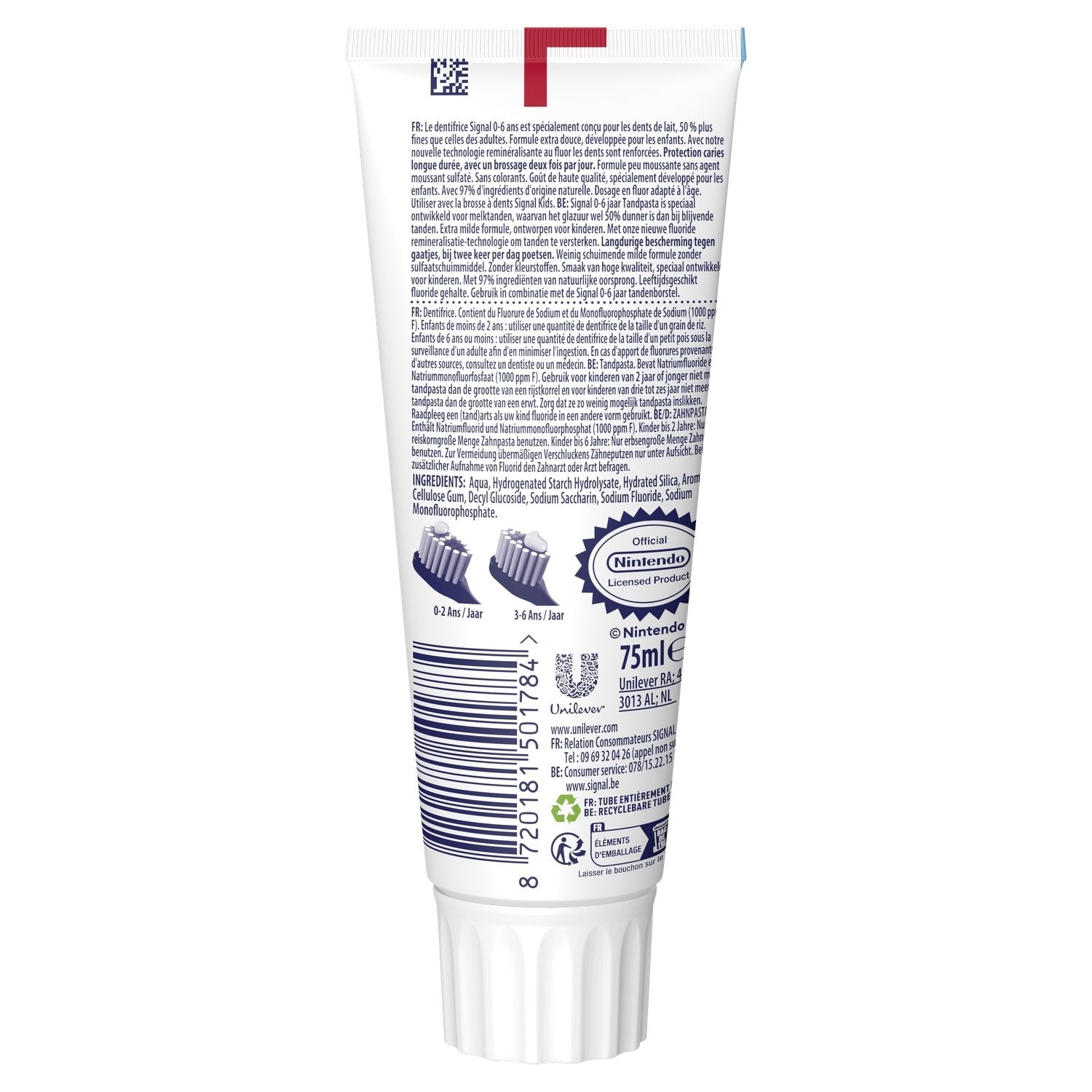 Le dentifrice enfant Signal Super Mario Arôme fruité 0-6 ans est spécialement conçu pour les dents de lait, 50 % plus fines que celles des adultes. Avec sa nouvelle technologie reminéralisante au fluor, il renforce et protège les dents contre les attaques acides à l'origine des caries. Son dosage en Fluor de 1000 ppm est adapté pour les enfants de 0 à 6 ans. Avec 97 % d'ingrédients d'origine naturelle, sans colorants, la formule extra douce de ce dentifrice a été développée pour les enfants. Peu moussante, elle ne contient pas d'agent moussant sulfaté. Votre enfant va par ailleurs adorer l'arôme fruité de ce dentifrice. Avec un brossage deux fois par jour, ce dentifrice enfant offre une protection longue durée contre les caries. Utilisez le dentifrice enfant Signal Arôme fruité 0-6 ans avec la brosse à dents Signal Kids 0-6 ans. Nous savons tous que les choix que nous faisons chaque jour ont un impact sur notre présent, mais également sur notre futur. Ceci est vrai pour notre santé et notamment pour notre santé bucco-dentaire. Notre mission chez Signal est de maintenir la santé de toutes les bouches, à chaque étape de la vie. Pour cela, Signal propose une large gamme de produits dentaires conçus pour répondre aux besoins spécifiques des enfants, des adolescents, des adultes et des seniors. Par ailleurs, Signal va dans les écoles depuis plus de 25 ans, pour apprendre aux enfants l'importance d'une bonne hygiène bucco-dentaire. Avec Signal, chaque sourire compte !