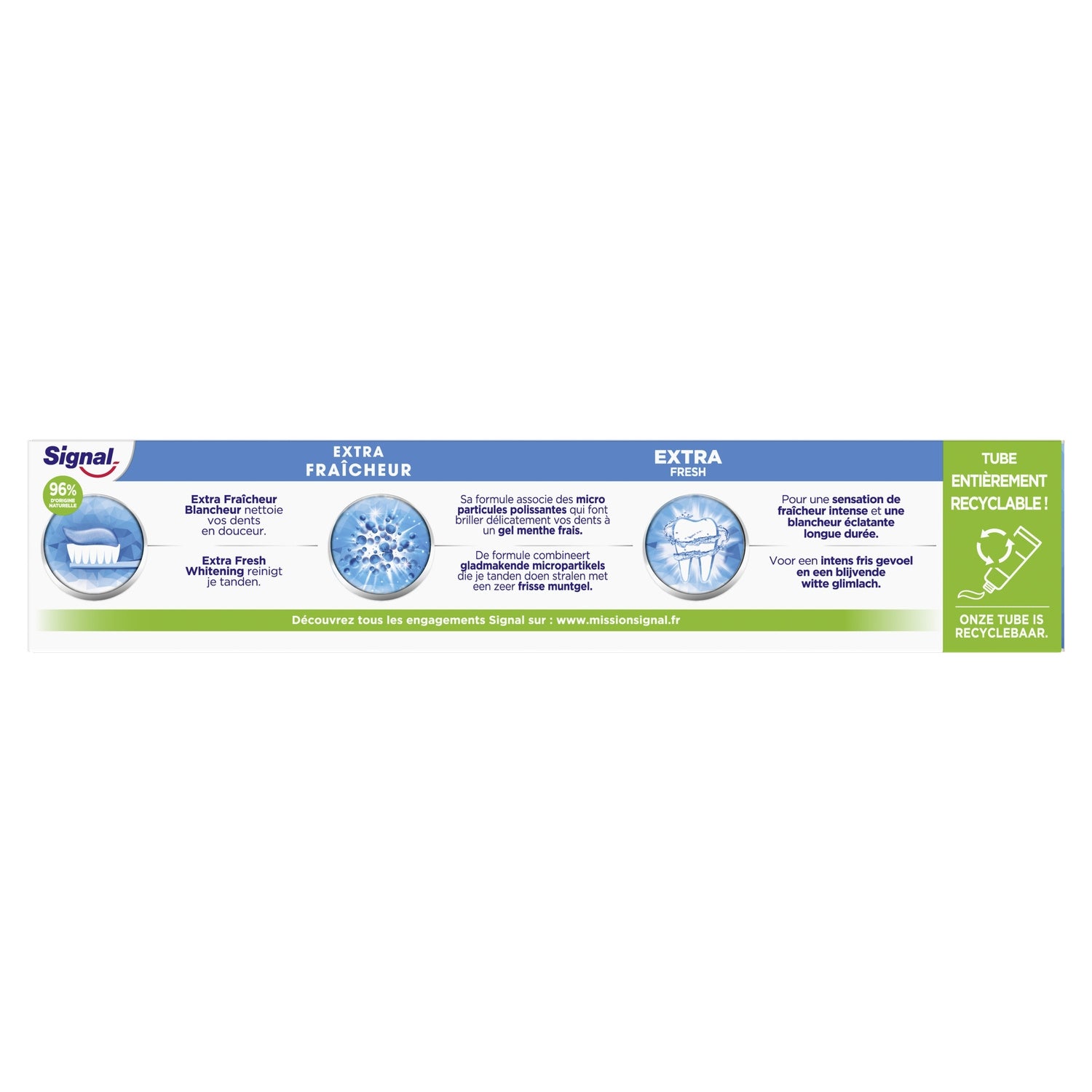 Le dentifrice Signal Extra Fraîcheur Blancheur fait délicatement briller les dents pour redonner à votre sourire toute sa blancheur.,Ce dentifrice associe un gel menthe frais à des micro particules polissantes pour une blancheur éclatante longue durée.,Sa formule laisse une sensation de fraîcheur intense et durable dans toute la bouche.,Ce dentifrice blancheur contient 96 % d'ingrédients d'origine naturelle.,Le tube de ce dentifrice est entièrement recyclable.,Pour une bonne santé bucco-dentaire, Signal recommande un brossage deux fois par jour, une brosse à dents neuve tous les trois mois et une visite chez le dentiste deux fois par an.