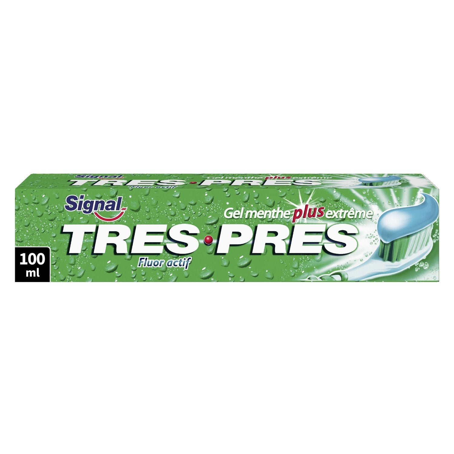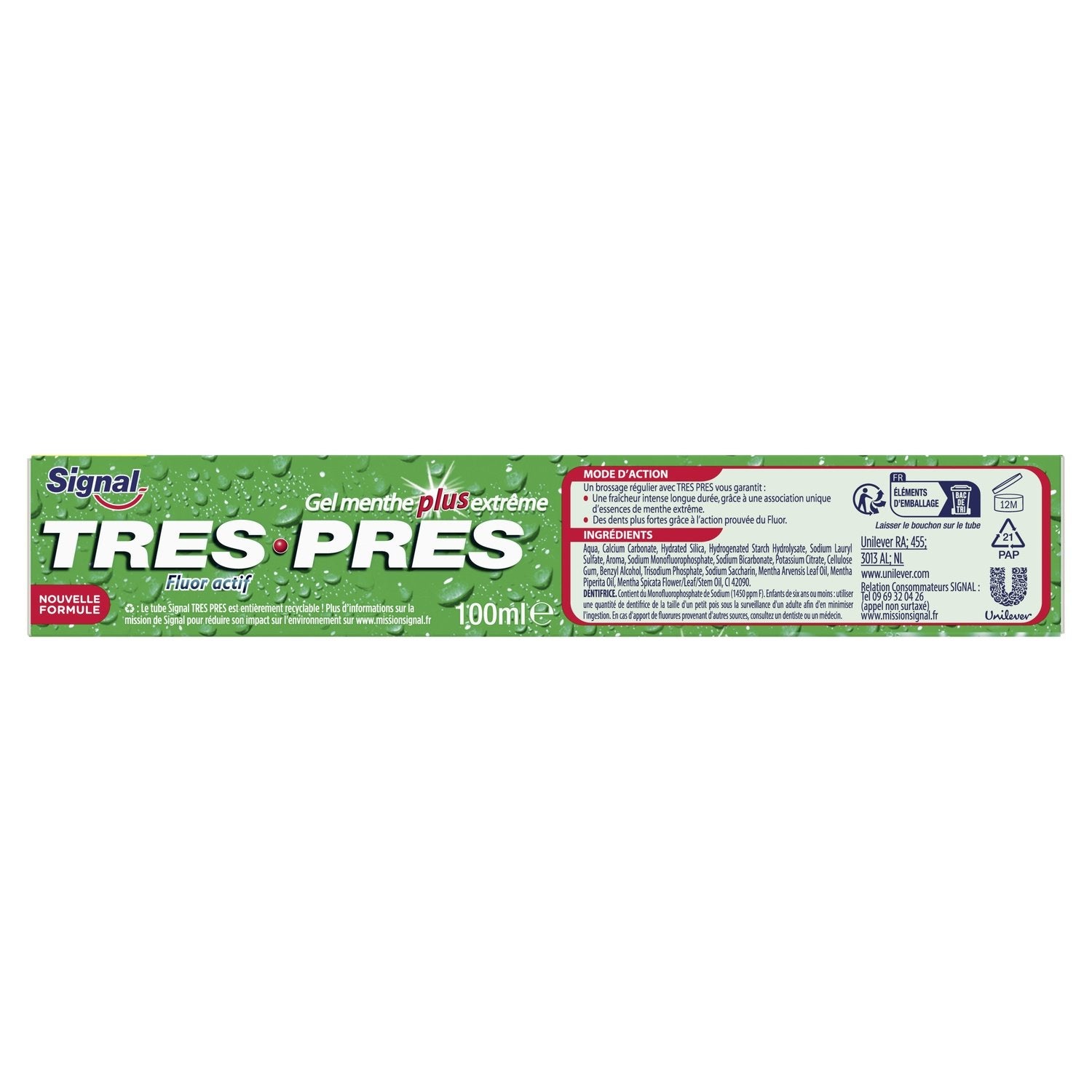 Le dentifrice Signal Très Près vous garantit une fraîcheur intense longue durée.,La formule de ce dentifrice contient une association unique d'essences de menthe extrême.,Un dentifrice qui rend les dents plus fortes grâce à l'action prouvée du fluor.,Conseils Signal : brossez-vous les dents après chaque repas pour une denture saine et sans caries,Conseils pour une bonne hygiène bucco-dentaire : brossez-vous les dents après chaque repas, changez de brosse à dents Signal tous les 2 à 3 mois et consultez votre dentiste au moins deux fois par an.,Découvrez également d'autres dentifrices Signal comme le dentifrice Signal Soin Fraîcheur ou le dentifrice Signal Crystal Gel.