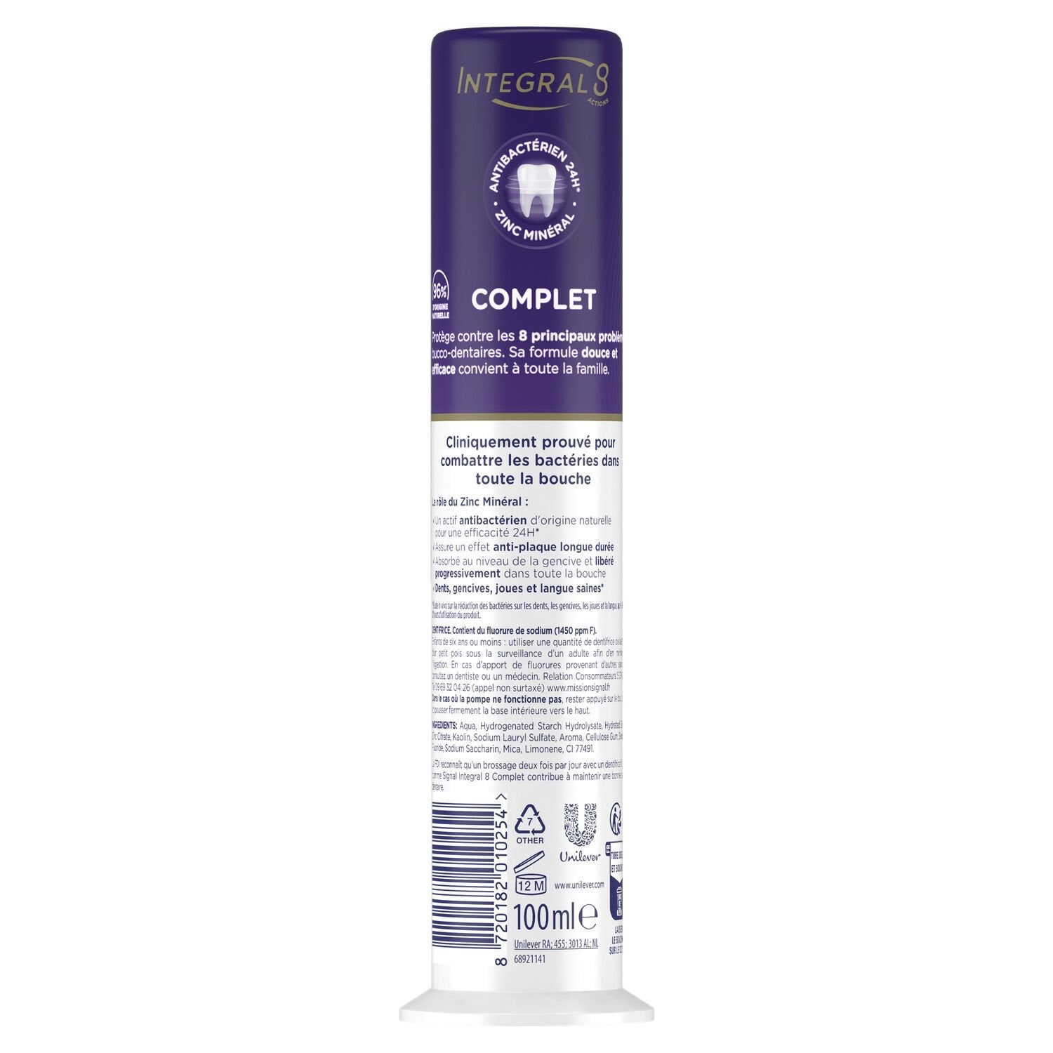 Offrez à votre bouche une protection intégrale avec le dentifrice Signal Integral 8 Soin Complet. Ce dentifrice lutte contre les 8 principaux problèmes bucco-dentaires : caries, plaque, tartre, blancheur, émail, sensibilité, gencives et haleine fraîche. Il contient un actif antibactérien d'origine naturelle, le zinc minéral, efficace contre la plaque dentaire pendant 18 h. Absorbé au niveau de la gencive, le zinc minéral est progressivement libéré dans toute la bouche pour une langue, des dents, des joues et des gencives saines*. La formule douce antibactérienne du dentifrice Signal Integral 8 Soin Complet convient à toute la famille. Chez Signal, nous pensons que votre sourire est l'expression de votre personnalité et de votre confiance en vous. Notre mission : améliorer la santé bucco-dentaire de tous, pour que chacun d'entre nous libère le pouvoir de son sourire. Signal accompagne les Français depuis 1961 pour leur transmettre les bons gestes, dès le plus jeune âge et démontrer l'importance d'un brossage deux fois par jour, matin et soir. Attentifs à la protection de la planète, nous prenons des mesures pour limiter l'impact environnemental de nos produits. En partenariat avec TerraCycle®, nous avons lancé un programme de recyclage gratuit, pour donner une seconde vie à vos brosses à dents et vos tubes de dentifrice. *Étude in vivo sur la réduction des bactéries sur les dents, les gencives, les joues et la langue, après 14 et 28 jours d'utilisation du produit.