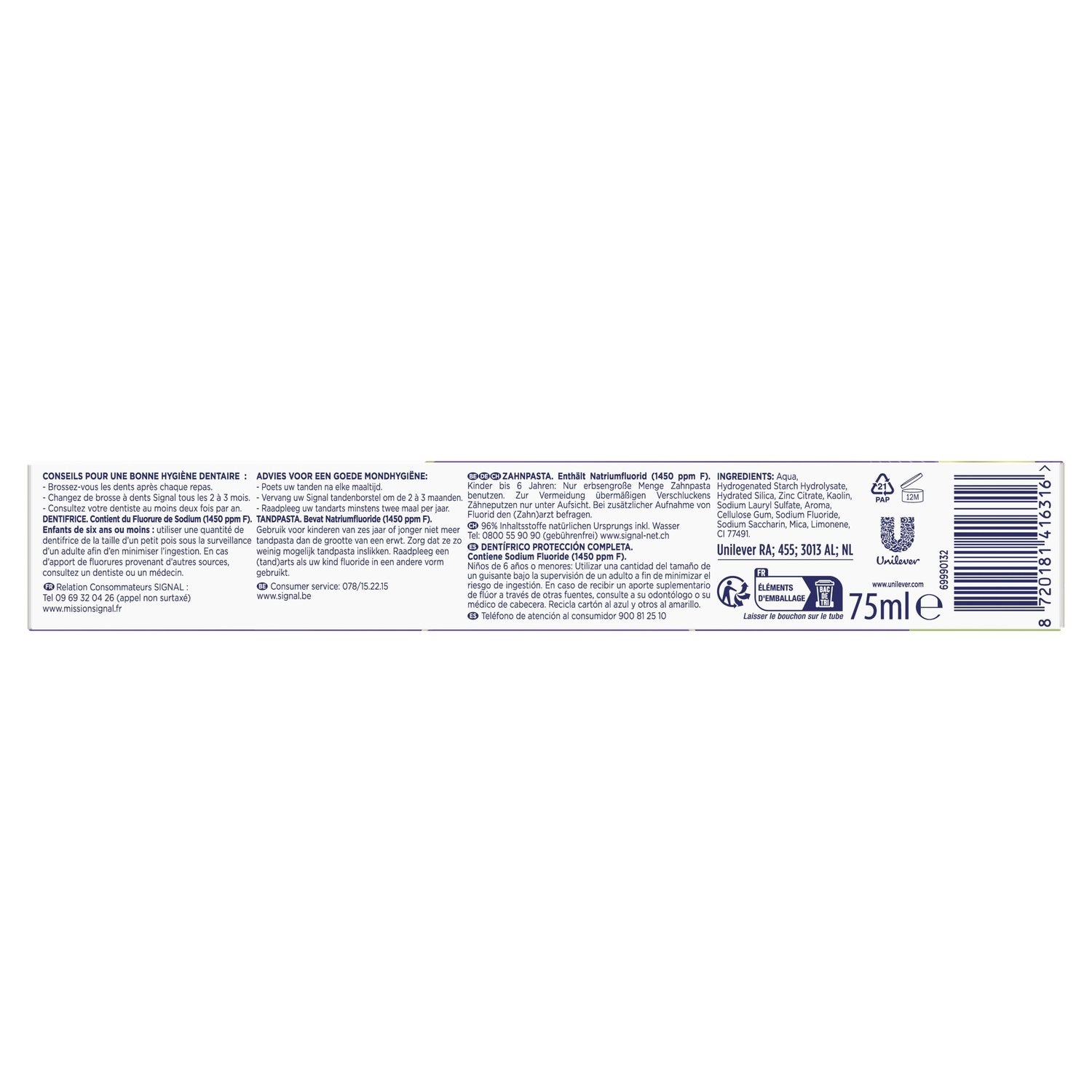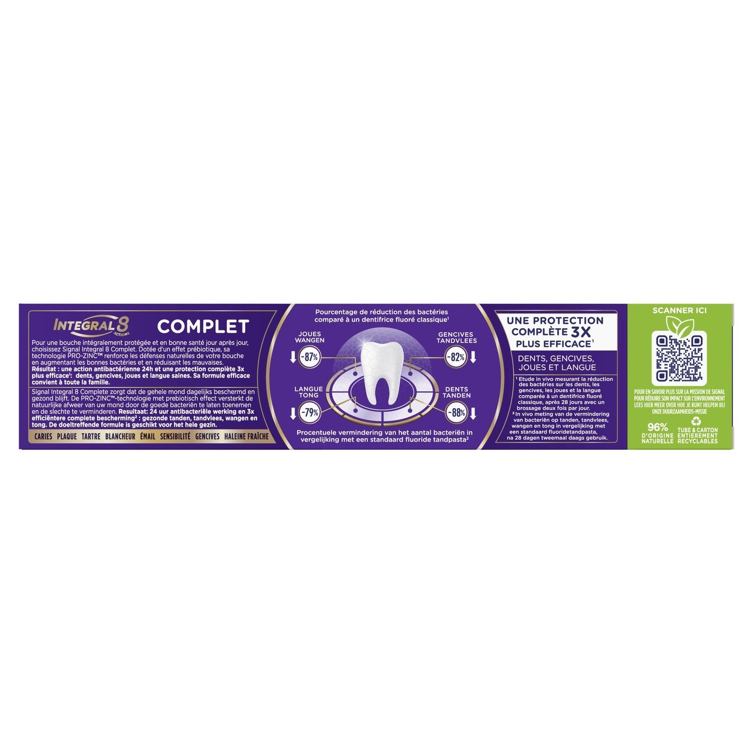 Le dentifrice Signal Integral 8 Complet offre une protection intégrale 3x plus efficace* de toute la bouche pour des dents, une langue, des joues et des gencives saines.,Il protège contre les huit principaux problèmes bucco-dentaires : caries, plaque, tartre, blancheur, émail, sensibilité, gencives et haleine fraîche.,Composée à 96 % d'ingrédients d'origine naturelle, la formule douce du dentifrice Complet convient à toute la famille.,Dotée d'un effet prébiotique, la technologie PRO-ZINC™ de ce dentifrice renforce les défenses naturelles de votre bouche en augmentant les bonnes bactéries et en réduisant les mauvaises.,Ce dentifrice a été cliniquement prouvé pour combattre les bactéries dans toute la bouche.,Nos conseils pour une meilleure hygiène bucco-dentaire : brossez-vous les dents après chaque repas et consultez votre dentiste au moins 2 fois par an.