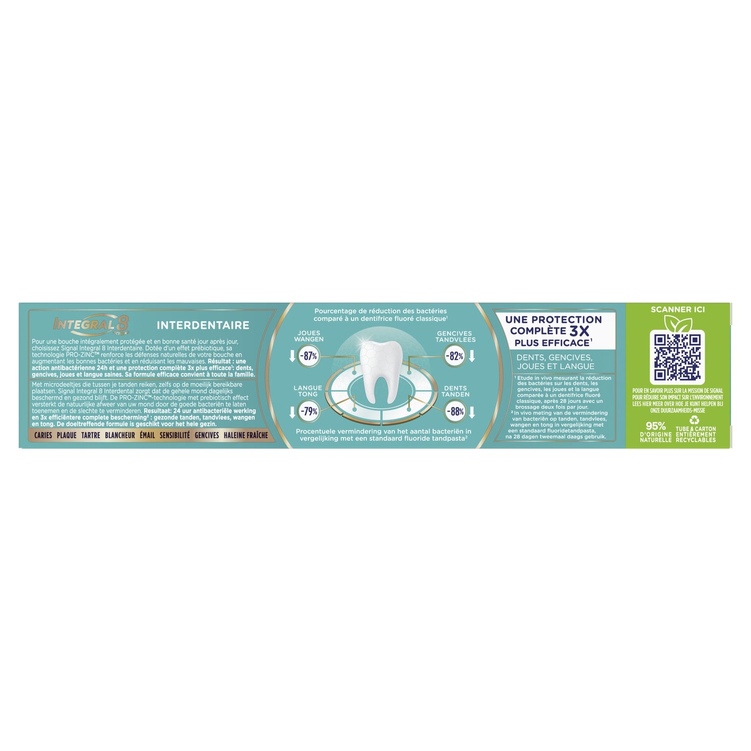 Pour une bouche intégralement protégée et en bonne santé jour après jour, choisissez le dentifrice Signal Integral 8 Interdentaire.,Sa formule élimine la plaque. Elle contient des microparticules pour atteindre les espaces interdentaires, même dans les zones difficiles d'accès.,Dotée d'un effet prébiotique, la technologie PRO-ZINC™ de ce dentifrice renforce les défenses naturelles de votre bouche en augmentant les bonnes bactéries et en réduisant les mauvaises.,Sa formule permet une action antibactérienne 24 h et une protection complète 3 x plus efficace¹ : dents, gencives, joues et langue saines.,Elle offre 8 actions : protection caries, protection gencives, émail renforcé, action blancheur, haleine fraîche, anti-plaque, anti-tartre et sensibilité.,Ce dentifrice Signal Integral 8 est composé de 95 % d'ingrédients d'origine naturelle et convient à toute la famille. Son tube et son carton sont entièrement recyclables.