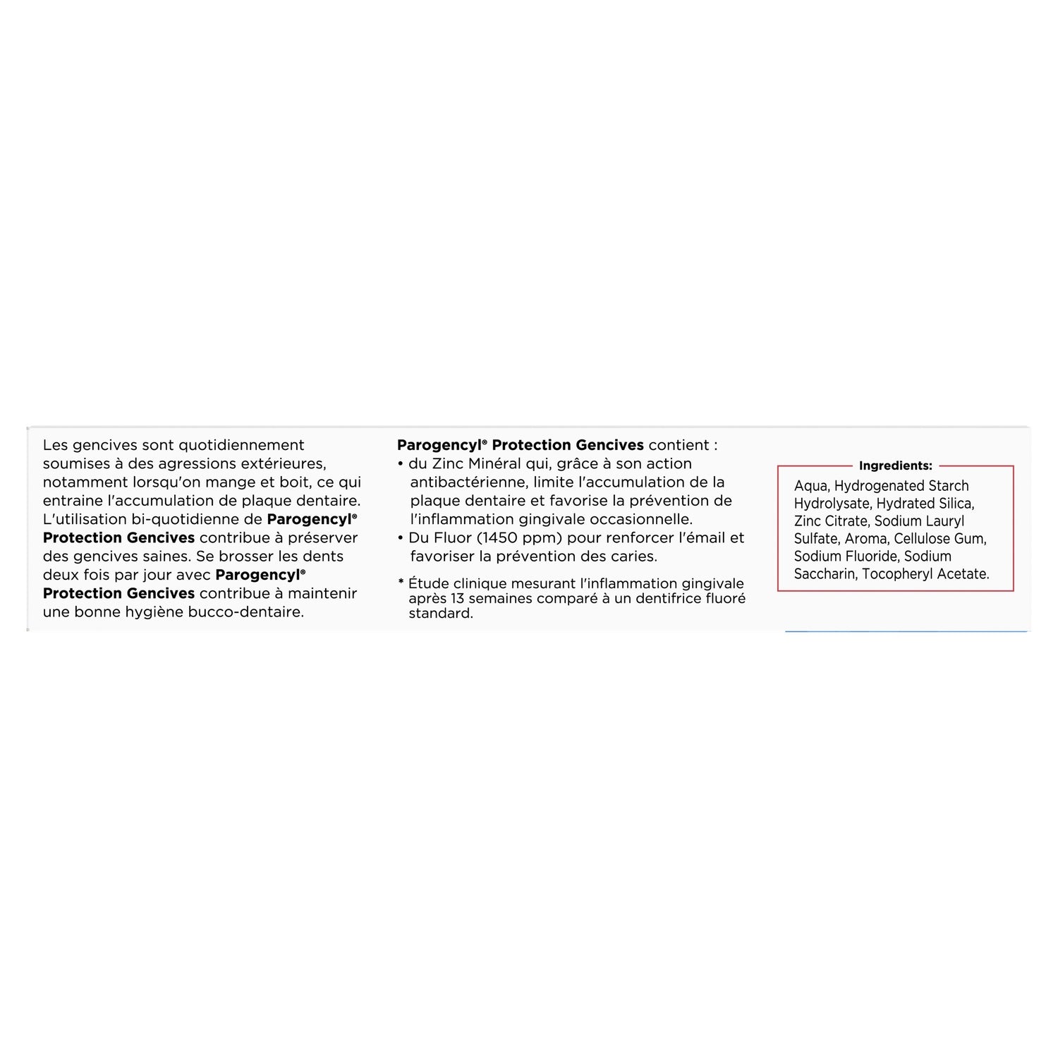 'Les gencives sont quotidiennement soumises à des agressions extérieures, notamment lorsqu'on mange et boit, ce qui entraine l'accumulation de plaque dentaire. L'utilisation bi-quotidienne de Parogencyl Protection Gencives contribue à préserver des gencives saines. Se brosser les dents deux fois par jour avec Parogencyl Protection Gencives contribue à maintenir une bonne hygiène bucco-dentaire. Parogencyl Protection Gencives contient : - du Zinc Minéral à 3% qui, grâce à son action antibactérienne, limite l'accumulation de la plaque dentaire et favorise la prévention de l'inflammation gingivale occasionnelle. - du Fluor (1450 ppm) pour renforcer l'émail et favoriser la prévention des caries.