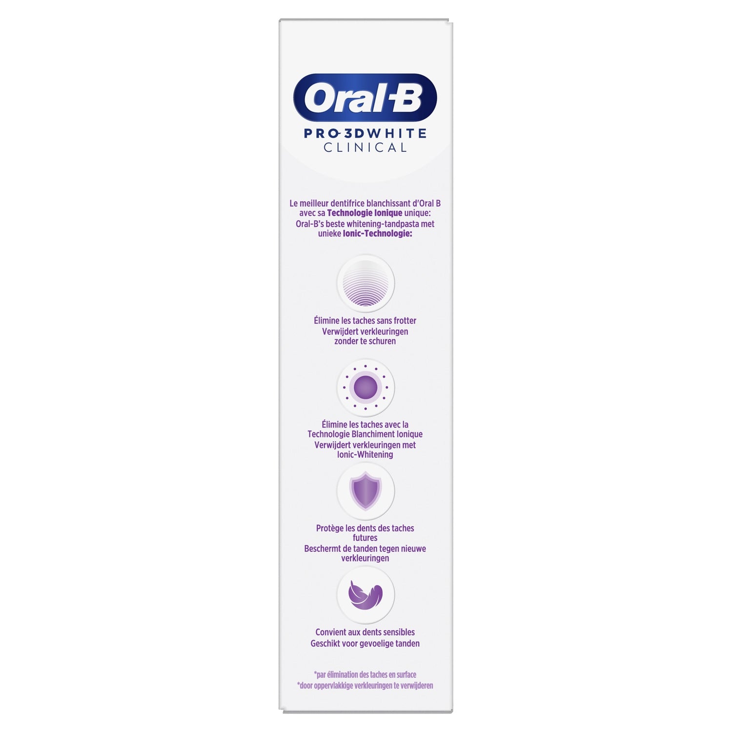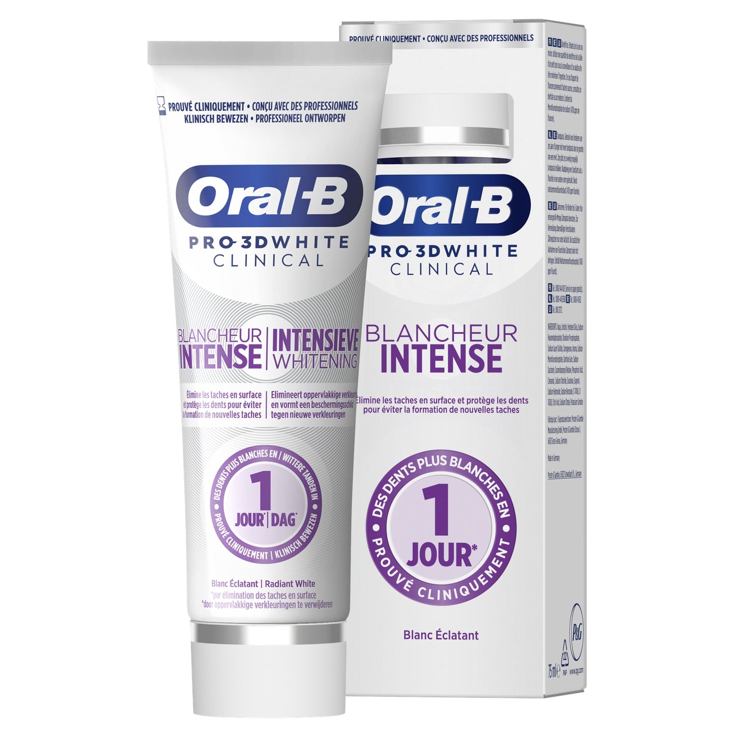 Le dentifrice Oral-B Pro 3D White Clinical Blancheur Intense est cliniquement prouvé pour des dents plus blanches en 1 jour en éliminant les taches en surface. C'est le meilleur dentifrice blancheur d'Oral-B avec sa technologie ionique unique : il désincruste les taches sans frotter, élimine les taches avec le blanchiment ionique, protège les dents contre l'apparition de nouvelles taches et convient aux dents sensibles.