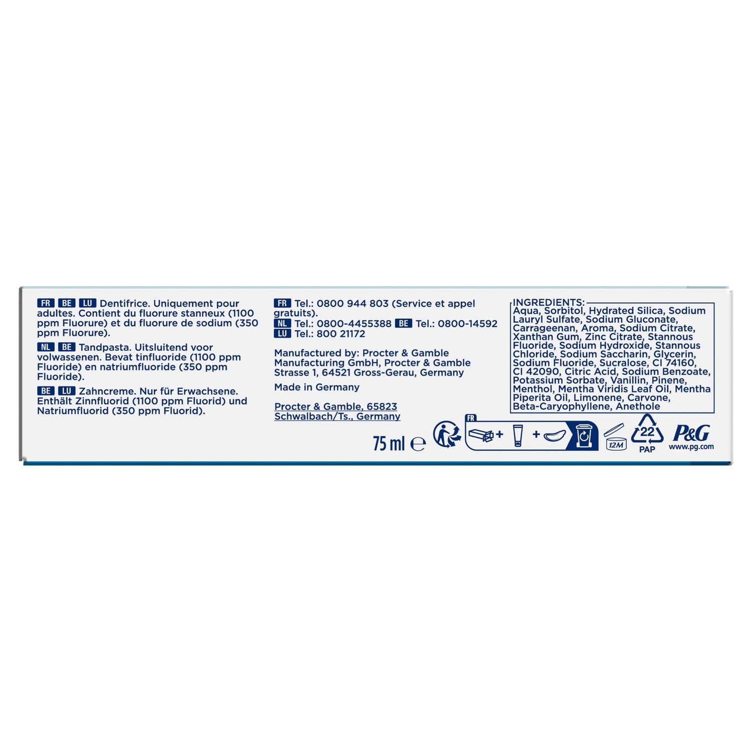 Aqua, Sorbitol, Hydrated Silica, Sodium Lauryl Sulfate, Sodium Gluconate, Carrageenan, Aroma, Sodium Citrate, Xanthan Gum, Zinc Citrate, Stannous Fluoride, Sodium Hydroxide, Stannous Chloride, Sodium Saccharin, Glycerin, Sodium Fluoride, Sucralose, CI 74160, CI 42090, Citric Acid, Sodium Benzoate, Potassium Sorbate, Vanillin, Pinene, Menthol, Mentha Viridis Leaf Oil, Mentha Piperita Oil, Limonene, Carvone, Beta-Caryophyllene, Anethole