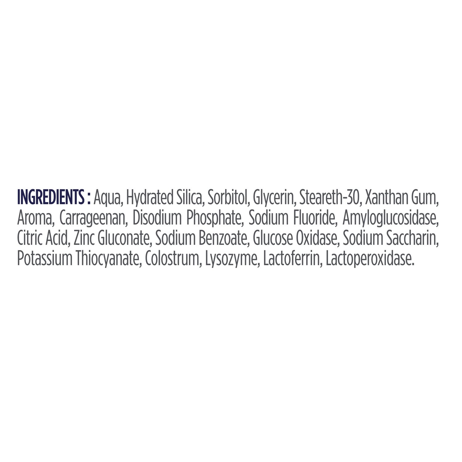 Ingredients: Aqua, Hydrated Silica, Sorbitol, Glycerin, Steareth-30, Xanthan Gum, Aroma, Carrageenan, Disodium Phosphate, Sodium Fluoride, Amyloglucosidase, Citric Acid, Zinc Gluconate, Sodium Benzoate, Glucose Oxidase, Sodium Saccharin, Potassium Thiocyanate, Colostrum, Lysozyme, Lactoferrin, Lactoperoxidase.