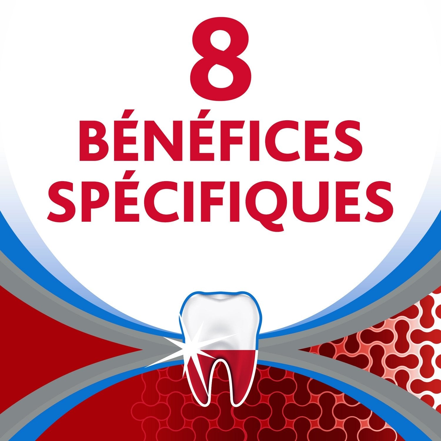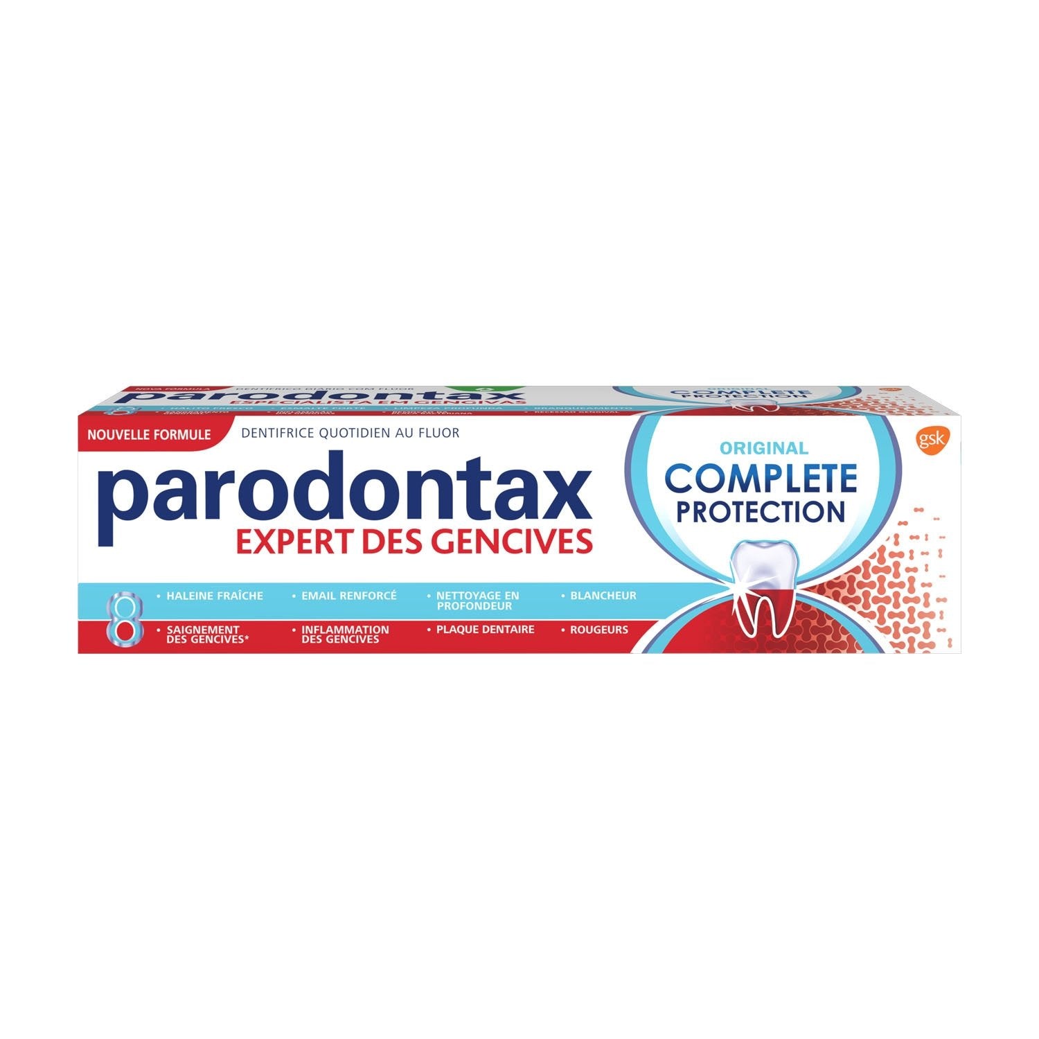 Le nouveau dentifrice parodontax Complete Protection Original vous apporte 8 bénéfices pour des gencives plus saines et des dents plus fortes: - Haleine fraîche - Email renforcé - Nettoyage en profondeur - Blancheur - Saignement des gencives* - Inflammation des gencives - Plaque dentaire - Rougeurs Il aide à arrêter et à prévenir le saignement des gencives, *en utilisation continue deux fois par jour. *saignement occasionnel
