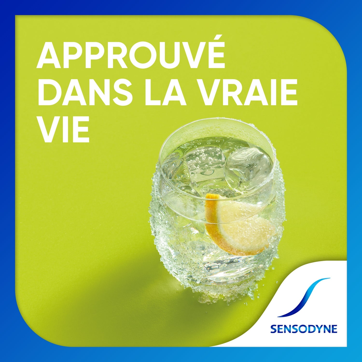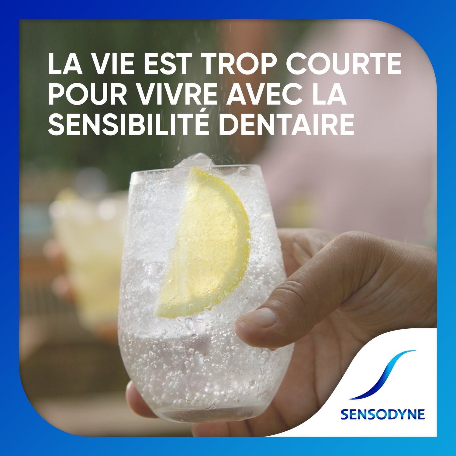 Dentifrice Sensodyne Protection Complète Le dentifrice Sensodyne Protection Complète est un dentifrice tout-en-un à utiliser quotidiennement pour soulager la sensibilité dentaire qui s'intensifie après 2 semaines de brossage*. Il contient du nitrate de potassium pour soulager efficacement la sensibilité dentaire et du fluorure de sodium pour combattre efficacement les attaques acides dans votre bouche et prévenir la formation des caries. * Il est fortement recommandé de se brosser les dents 2 fois par jour et de procéder à des brossages de plus de 60 secondes afin de pouvoir bénéficier pleinement des bienfaits que peut procurer le dentifrice Sensodyne Protection complète.