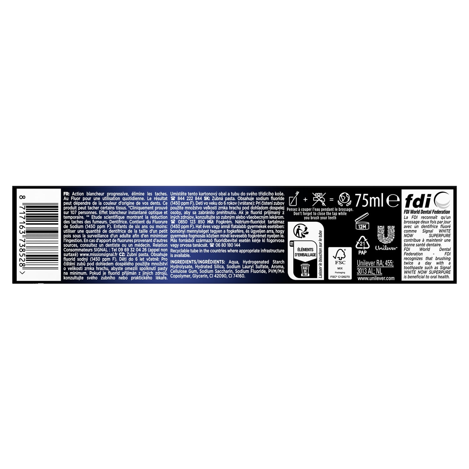 Le dentifrice Signal White Now Super Pure améliore la blancheur de vos dents,Il blanchit instantanément* vos dents et cible efficacement les taches de nicotine**, de café et de vin rouge pour une action blancheur continue,Ce dentifrice est composé de pigments bleu saphir qui agissent comme les produits cosmétiques correcteurs de couleur pour neutraliser la nuance jaunâtre et booster la blancheur de vos dents,Cliniquement prouvé et respectueux de l'émail, le dentifrice White Now contient des ingrédients blancheur instantanée non abrasifs et du fluor pour un usage quotidien,Le tube souple de ce dentifrice blancheur est 100 % recyclable, déposez-le dans un point collecte TerraCycle® afin qu'il soit recyclé,Pour une bonne hygiène bucco-dentaire : brossez-vous les dents après chaque repas, changez de brosse à dents Signal tous les 2 à 3 mois et consultez votre dentiste au moins 2 fois par an