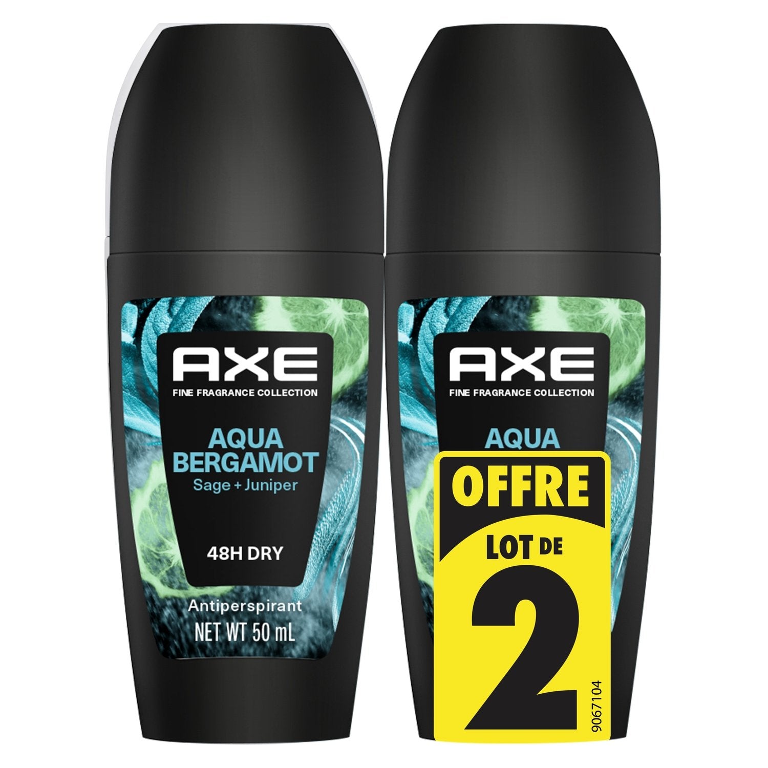 Découvre le déodorant homme bille AXE Aqua Bergamot issu de notre gamme Collection Parfum Prestige, au format 2x50 ml.,Reste confiant toute la journée grâce à la protection anti-odeurs de 48 h du déodorant bille AXE Aqua Bergamot.,Collection Parfum Prestige : déodorant au parfum frais, enrichi en huiles essentielles de bergamote, sauge et genévrier, et élaboré par des maîtres parfumeurs reconnus dans le monde entier.,Un format bille ultra-pratique pour un déodorant qui sèche 2 x plus vite*.,L'emballage de ce déodorant pour homme AXE est entièrement recyclable. Dépose-moi dans le bac de tri !,Tu aimes le parfum de ce déodorant ? AXE Aqua Bergamot existe aussi en gel douche pour encore plus de fraîcheur.