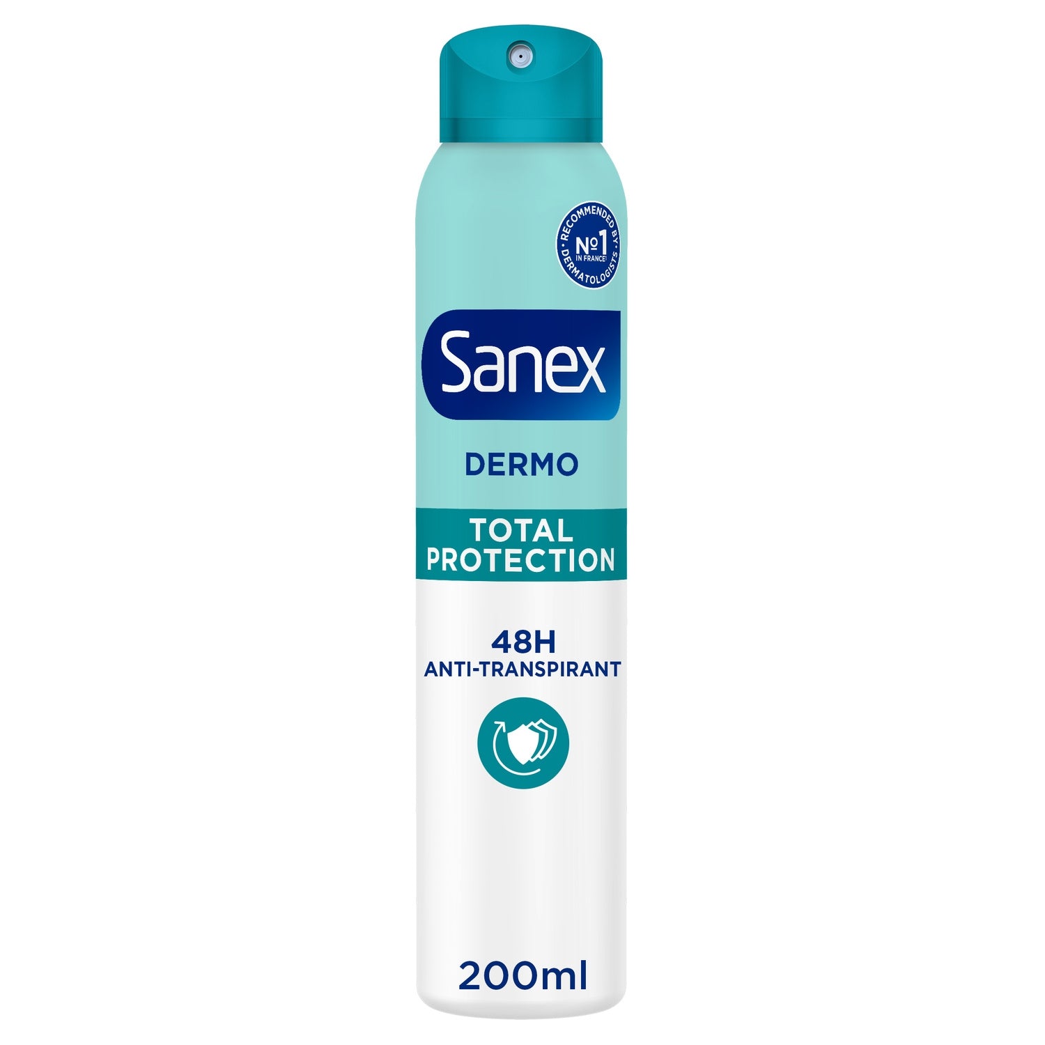 L'anti-transpirant spray Sanex Dermo Total Protection protège contre la transpiration, les odeurs, les bactéries, les irritations et les traces pendant 48 heures. Soin de la peau avec des ingrédients nourrissants supplémentaires.