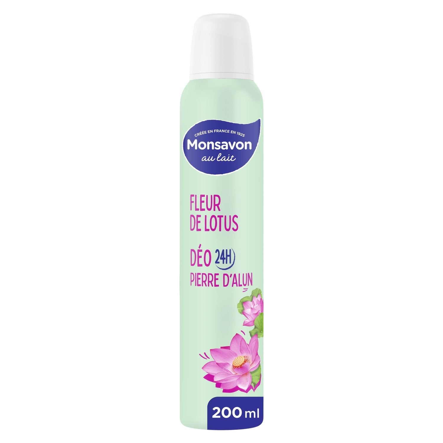 Découvrez le déodorant spay femme parfum Fleur de Lotus Monsavon au lait.,Un déodorant spray offrant une efficacité contre les odeurs pendant 24h,Un parfum longue durée Fleur de Lotus pour une sensation de fraîcheur tout au long de la journée,Une formule sans alcool respectueuse de votre peau,Formule testée dermatologiquement.,Flacon en aluminium entièrement recyclable. Une fois qu'il sera vide, pensez à recycler votre aérosol!