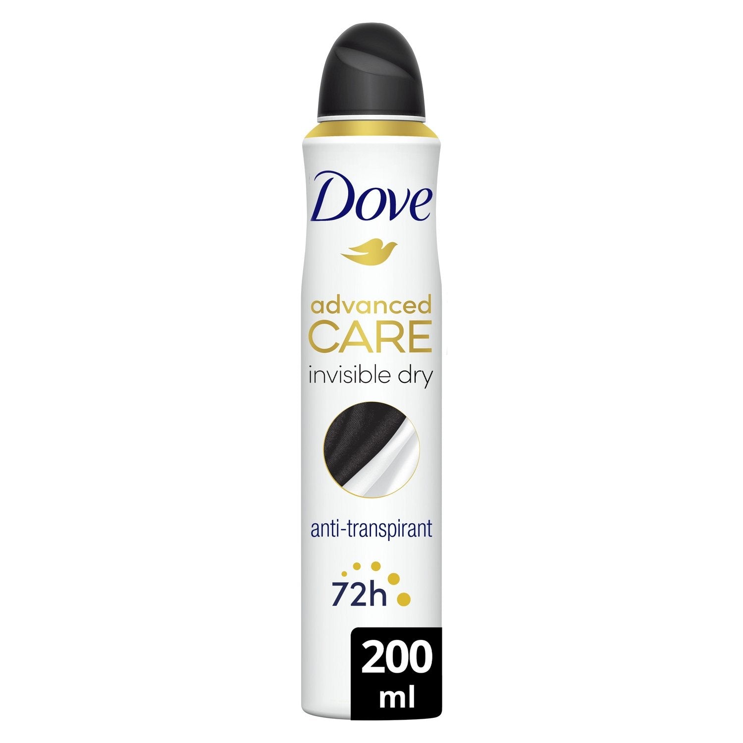 Le déodorant spray anti-transpirant Dove Advanced Care Invisible Dry prend soin de vos aisselles et de vos vêtements au quotidien.,Ce déodorant anti transpirant est doté d'une technologie anti-traces blanches et a été testé sur 100 couleurs pour que chaque femme puisse porter les couleurs qu'elle souhaite.,À la technologie hydratante triple action, le deodorant femme Dove Advanced Care laisse vos aisselles hydratées, douces et lisses.,Grâce à sa technologie anti-transpirante brevetée, le déodorant femme Dove Advanced Care combat efficacement la transpiration et vous procure 72 h de protection anti-transpirante.,Dove Advanced Care est notre gamme la plus experte en soin. Ce déodorant spray révèle la beauté de vos aisselles.,Le déodorant spray Dove Advanced Care Invisible Dry 200 ml est fabriqué dans une usine utilisant 100% d'électricité renouvelable et son flacon est conçu en aluminium, matériau recyclable à l'infini.