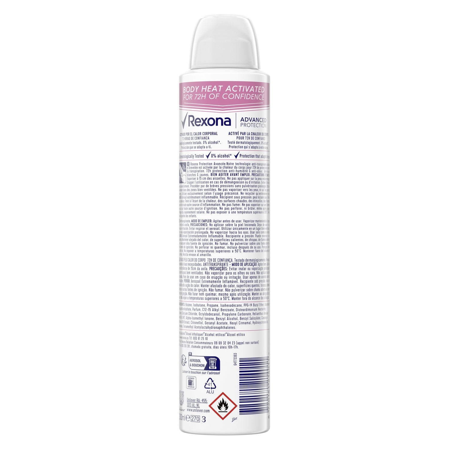 L'anti-transpirant Rexona Advanced Protection Invisible Pure offre 72 h de protection contre la transpiration et protège des traces blanches et jaunes,La technologie anti-transpirante brevetée de ce déodorant est activée par la chaleur du corps,Ce déodorant anti-transpirant dégage un parfum frais, floral et légèrement fruité de rose, jasmin et agrumes,Le déodorant anti-transpirant Rexona Advanced Protection Invisible Pure contient une formule 0 % alcool*,L'emballage de ce déodorant anti-transpirant en spray est majoritairement recyclable,Ce déodorant femme Rexona ne vous laissera pas tomber