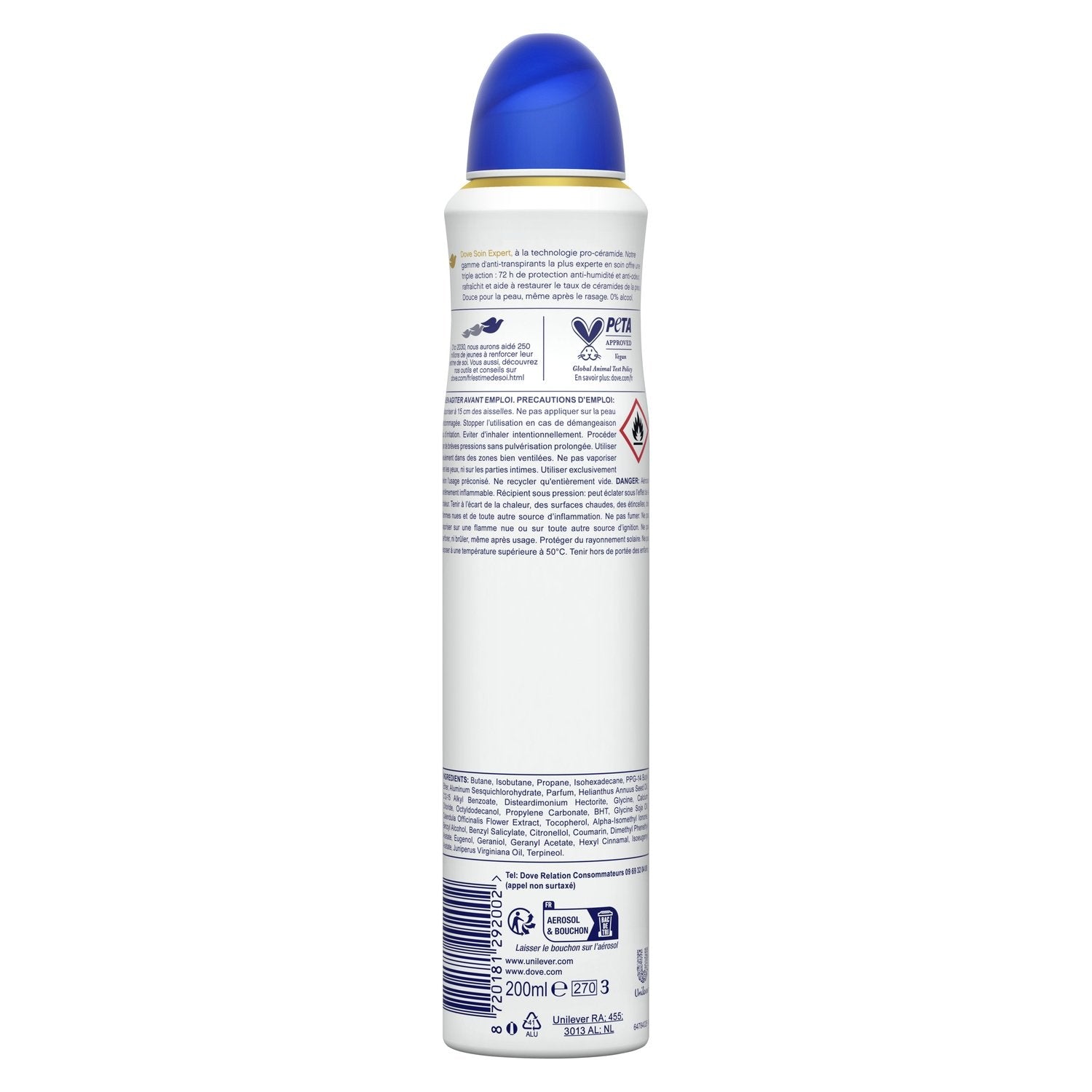 Le déodorant spray anti-transpirant Dove Advanced Care Original prend soin de vos aisselles au quotidien.,À la technologie hydratante triple action, le déodorant anti transpirant Dove Advanced Care laisse vos aisselles hydratées, douces et lisses.,Grâce à sa technologie anti-transpirante brevetée, Dove Advanced Care combat efficacement la transpiration et vous procure 72 h de protection anti-transpirante.,Dove Advanced Care est notre gamme la plus experte en soin et révèle la beauté de vos aisselles.,Le déodorant Dove Advanced Care Original 200 ml est fabriqué dans une usine utilisant 100 % d'électricité renouvelable et son flacon est conçu en aluminium, matériau recyclable à l'infini.,Avec le parfum iconique poudré et ambré de Dove Original, démarrez votre journée en toute confiance !