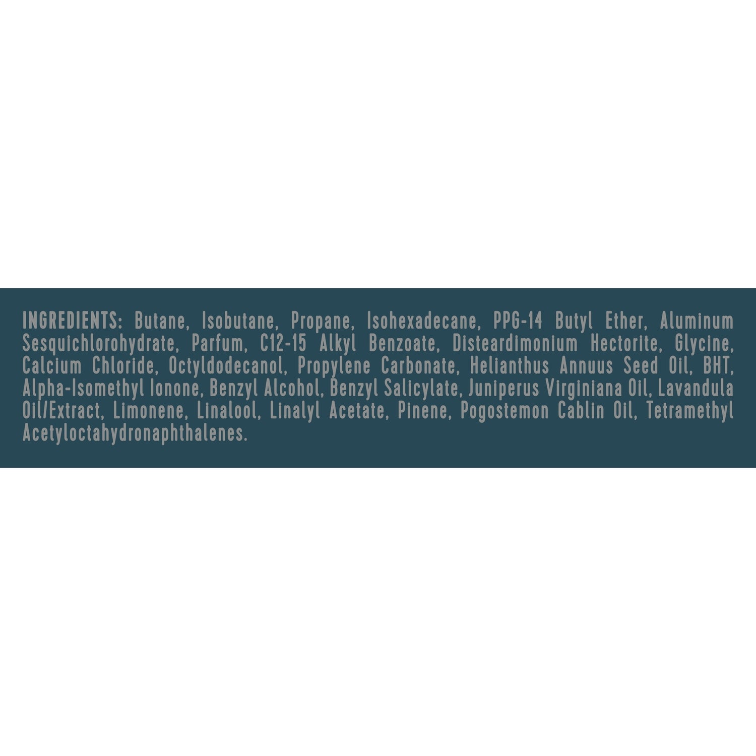 INGREDIENTS: Butane, Isobutane, Propane, Isohexadecane, PPG-14 Butyl Ether, Aluminum Sesquichlorohydrate, Parfum, C12-15 Alkyl Benzoate, Disteardimonium Hectorite, Glycine, Calcium Chloride, Octyldodecanol, Propylene Carbonate, Helianthus Annuus Seed Oil, BHT, Alpha-Isomethyl Ionone, Benzyl Alcohol, Benzyl Salicylate, Juniperus Virginiana Oil, Lavandula Oil/Extract, Limonene, Linalool, Linalyl Acetate, Pinene, Pogostemon Cablin Oil, Tetramethyl Acetyloctahydronaphthalenes.