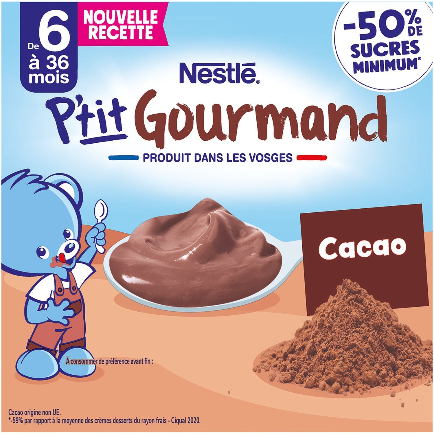P'TIT GOURMAND Cacao, le laitage qui a du bon conçu exprès pour bébé*, -50% de sucres Minimum**. Élaboré avec des ingrédients de qualité*, ce laitage gourmand au bon goût de cacao ravira ses papilles dès l'âge de 6 mois. Une recette produite dans les Vosges. Pratique pour les parents, ce laitage destiné à bébé vous accompagne partout. Il peut être conservé à température ambiante jusqu'à son ouverture. *Conformément à la réglementation sur les aliments pour bébés. **-59% de sucres par rapport à la moyenne des crèmes desserts du rayon frais - Ciqual 2020. Cacao origine non UE.
