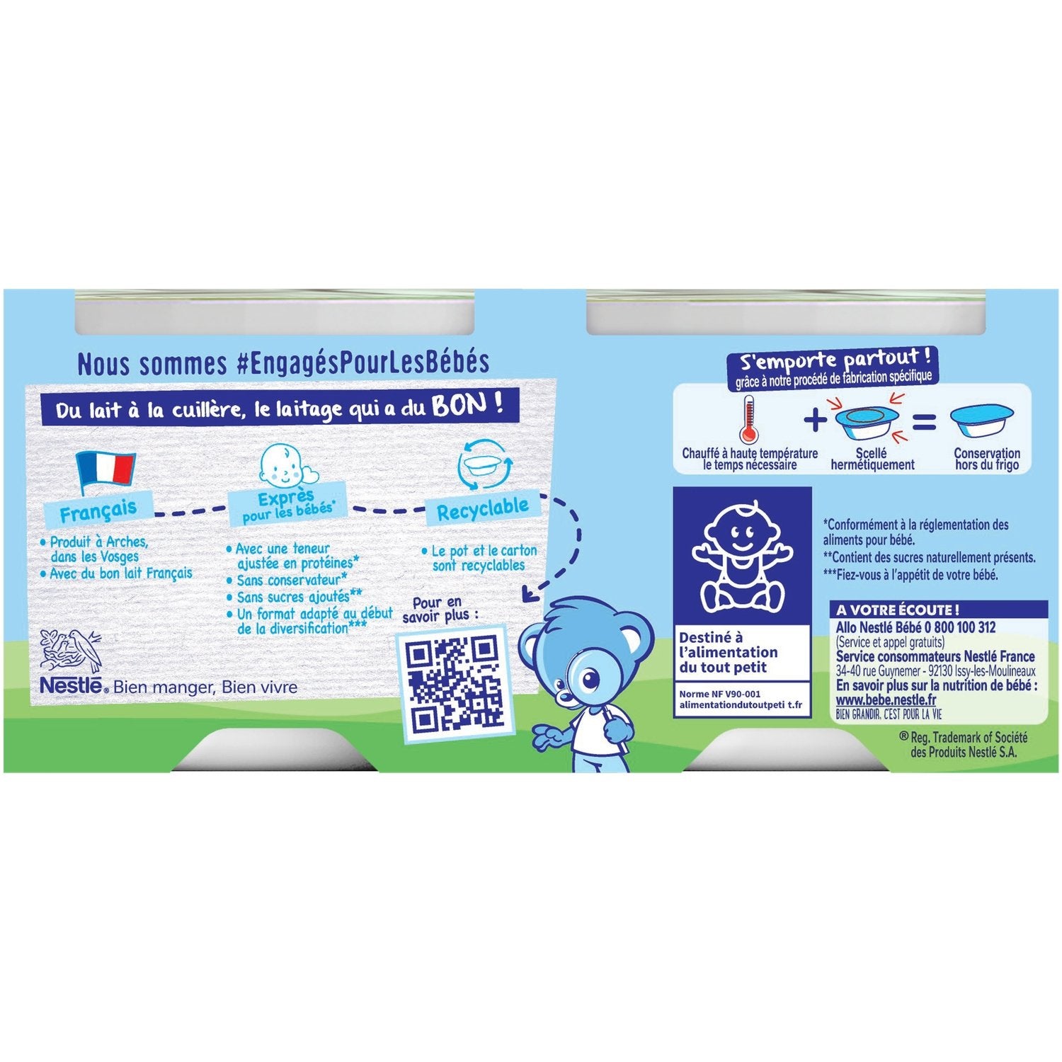 Sans sucres ajoutés*. *Contient des sucres naturellement présents.,Une teneur ajustée en protéines**. Sans conservateur**.Sans colorant**.**Conformément à la réglementation sur les aliments pour bébés.,Un format adapté au début de la diversification***.***Fiez-vous de l'appétit de votre bébé.,Produit à Arches dans les Vosges.,Le pot et le carton sont recyclables.