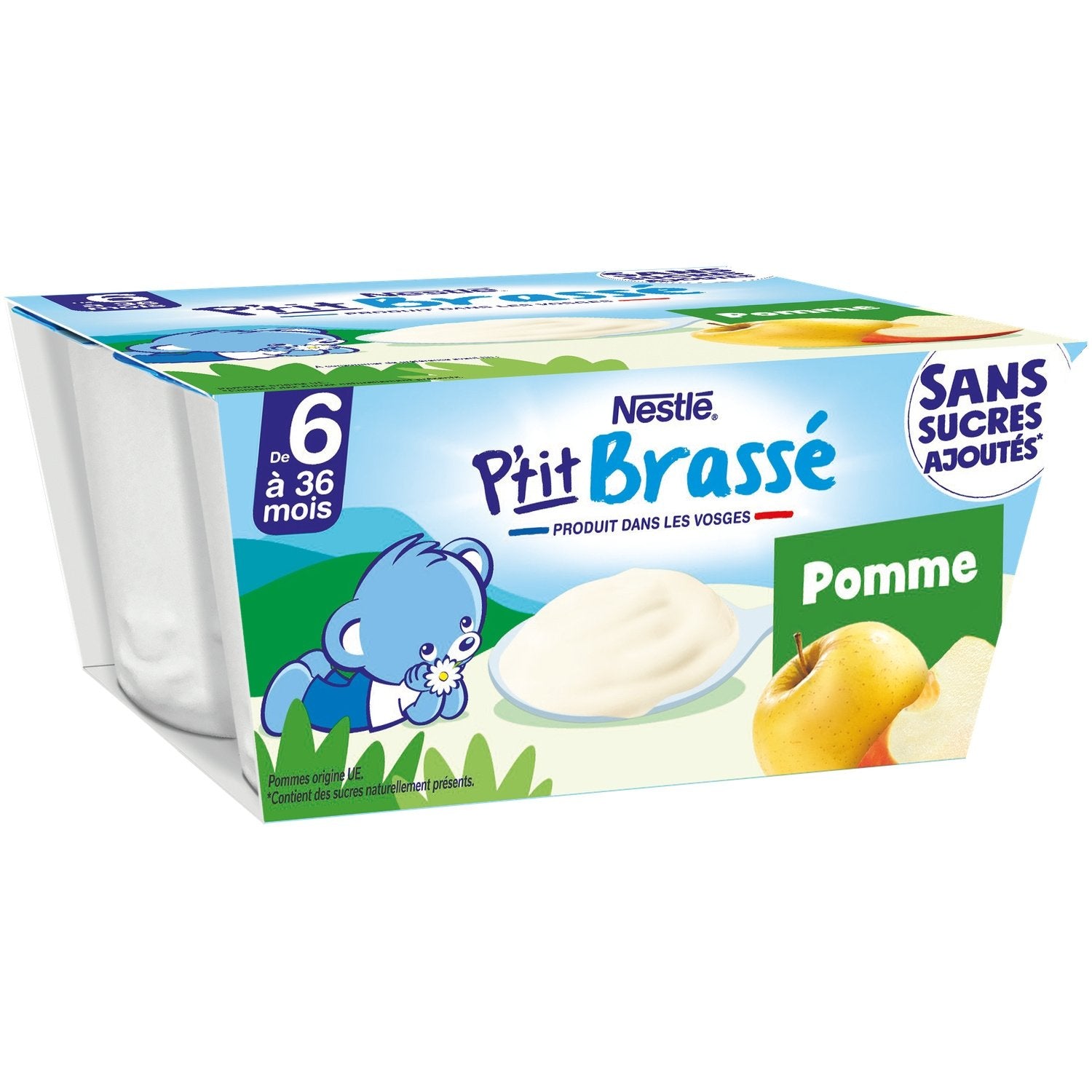 PTIT BRASSE Pomme Sans Sucres Ajoutés* avec 4 fois plus de fruits**. Un laitage conçu exprès pour bébé*** et produit à Arches dans les Vosges avec du lait français. Pratique, il s'emporte partout grâce à notre procédé de fabrication spécifique qui permet une conservation hors du frigo. *Contient des sucres naturellement présents. **Par rapport à la moyenne des P'tit Brassé aux fruits sucrés ***Conformément à la réglementation des aliments pour bébés. Pomme origine UE.