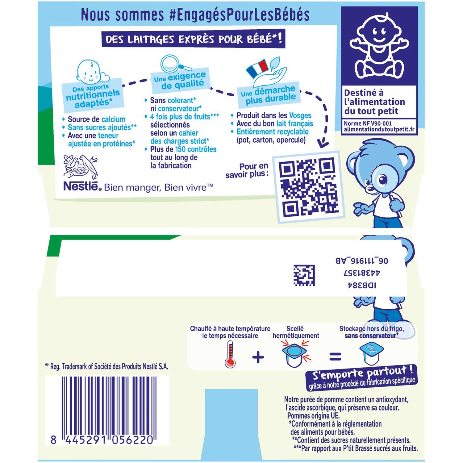 Sans sucres ajoutés* avec 4 fois plus de fruits**.,Un laitage conçu exprès pour bébé***.,Source de calcium avec une teneur ajustée en protéines***.,Sans conservateur***, sans colorant***.,Produit dans les Vosges avec du lait français.,*Contient des sucres naturellement présents.**Par rapport à la moyenne des P'tit Brassé aux fruits sucrés ***Conformément à la réglementation des aliments pour bébés.