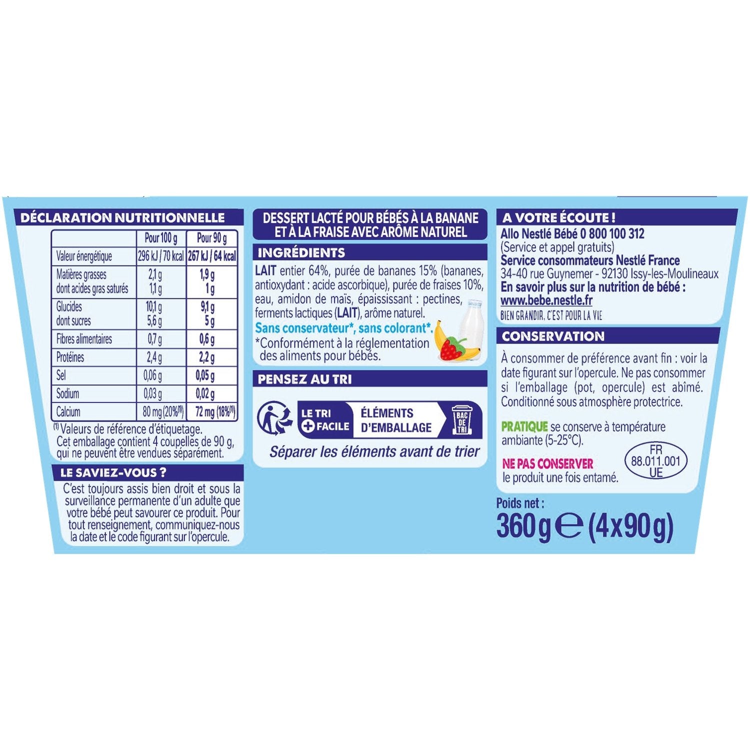 Sans sucres ajoutés* avec 4 fois plus de fruits**.,Un laitage conçu exprès pour bébé***.,Source de calcium avec une teneur ajustée en protéines***. ***Conformément à la réglementation sur les aliments pour bébés.,Produit dans les Vosges avec du lait local****. ****Une majorité de notre lait provient de coopératives à moins de 200km de notre lieu de fabrication. Fraise origine UE, Banane origine non UE.
