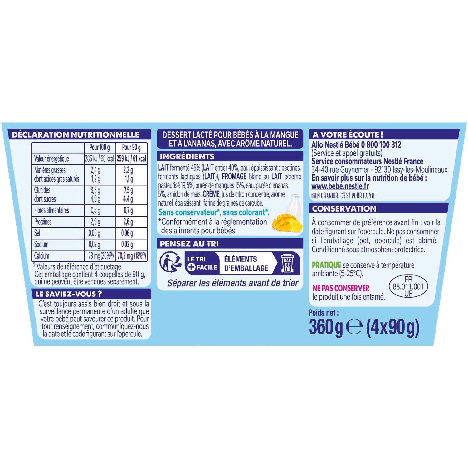 DétailsDessert lacté pour bébés à la mangue et à l'ananas, avec arôme naturel Poids unitaire : 390 grs Code-barres EAN : 7613287930491 Marque : NESTLE