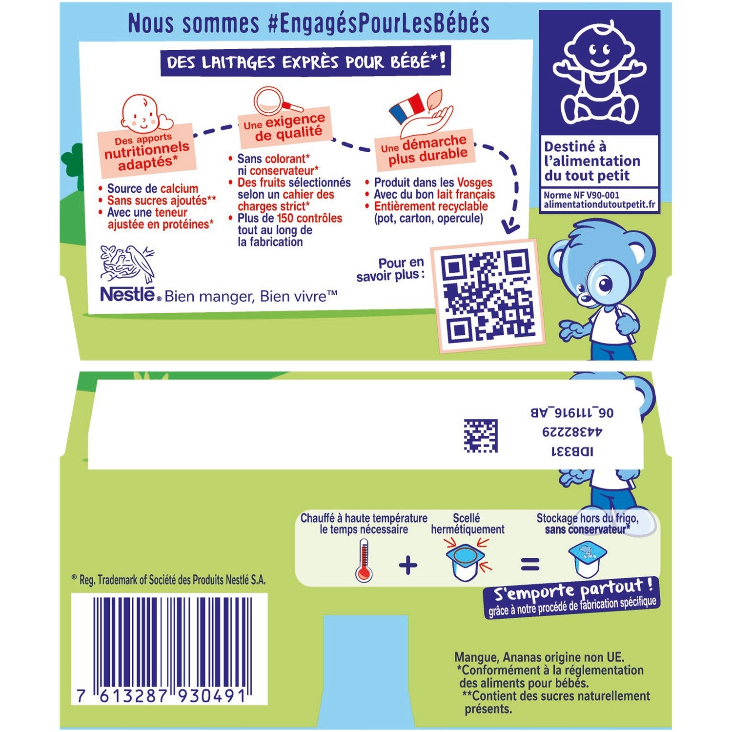 Le laitage qui a du bon conçu exprès pour bébé*. *Conformément à la réglementation des aliments pour bébés.,Sans sucres ajoutés**.**Contient des sucres naturellement présents.,Avec une teneur ajustée en protéines*.*Conformément à la réglementation des aliments pour bébés.,Du calcium pour contribuer au développement normal des os de bébé. A consommer dans le cadre d'une alimentation variée et d'un mode de vie sain.,Sans colorant*, sans conservateur*,*Conformément à la réglementation des aliments pour bébés.,Pot, opercule et carton sont recyclables.