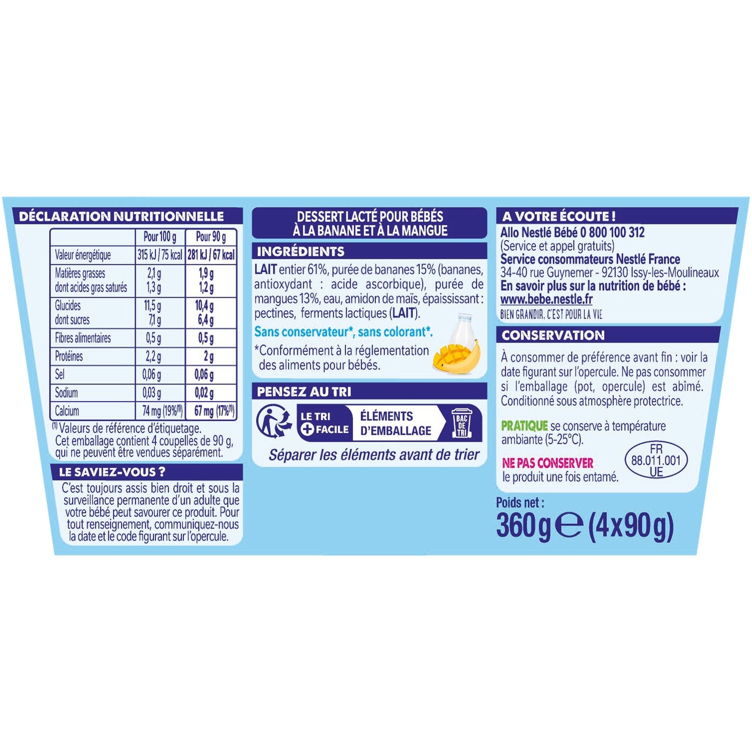 Ingrédients : LAIT entier 61%, purée de bananes 15% (bananes, antioxydant : acide ascorbique), purée de mangues 13%, eau, amidon de maïs, épaississant : pectines, ferments lactiques (LAIT).